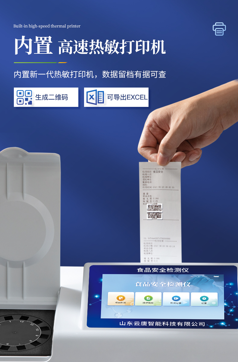 8.4、打印系统:内置全新打印机,可以打?。合钅棵?,二维码,抽样信息、检测信息,受检信息、复核信息、抽样日期、检测日期等信息的打印。