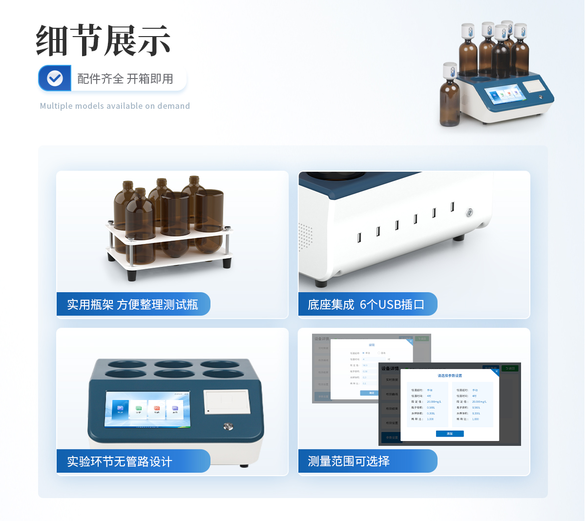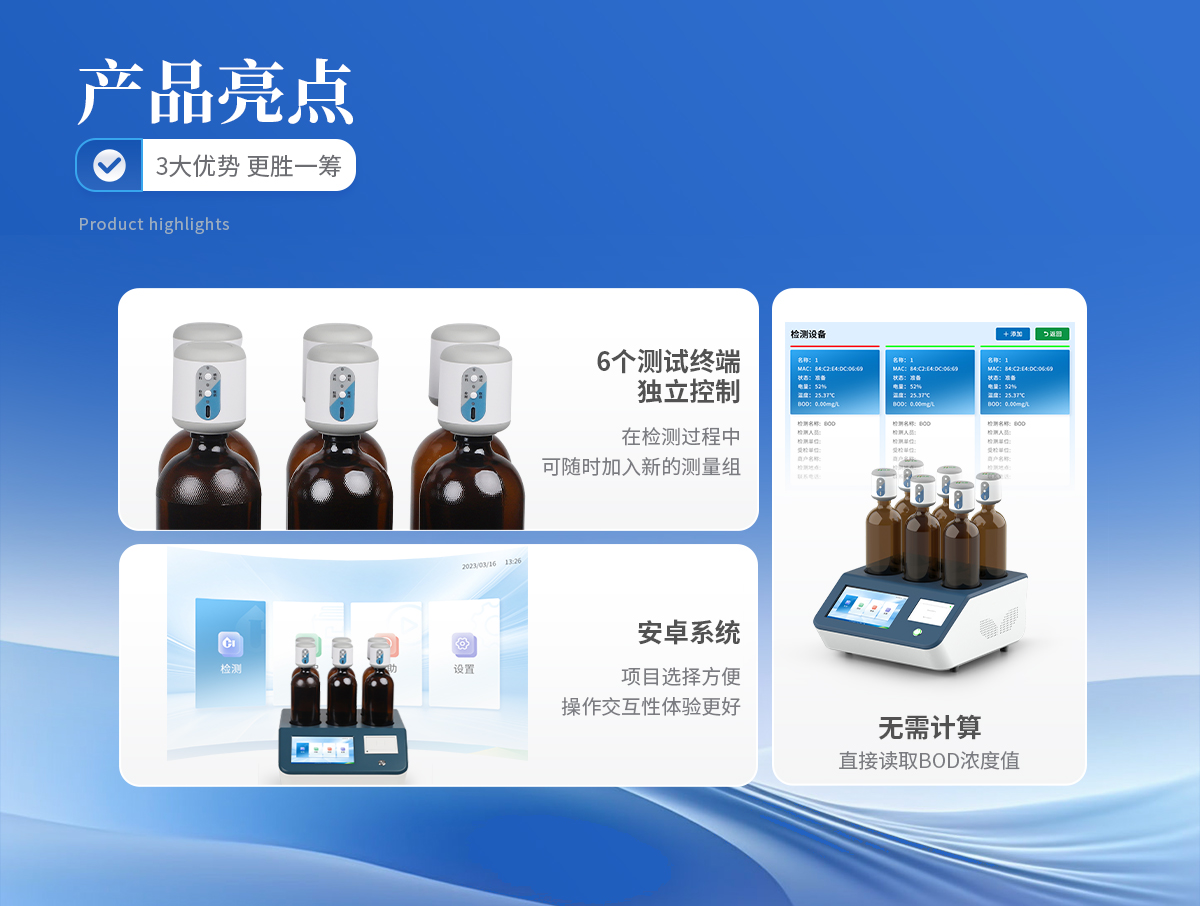1、采用国际**的无汞压差法,无汞污染,且数据准确可靠; 2、6个测试终端,独立控制,在检测过程中可随时加入新的测量组; 3、Android系统,操作交互性体验更好,更加简便快捷; 4、7英寸液晶触摸屏,人性化设计的人机交互,所有数值对比显示,简单直观; 5、无需人工换算,仪器可直接显示BOD浓度值,多组数据可在统一界面显示; 6、仪器可自动分析并绘制出测定水样的数据曲线,多组曲线可在统一界面显示; 7、测试终端与主机通过蓝牙连接,将数据无线传输到主机显示。 8、每个测试终端内置大容量锂电池,电池寿命2年以上,短暂停电对测试无影响; 9、底座集成了6个USB插口,可以直接用来给测试终端充电,充满电使用长达半年以上。 10、实验环节无管路设计,避免管路老化、漏气等弊端; 11、测量范围可选择,在水样浓度低于4000g/L时,无需稀释; 12、测定仪自动记录测量数据,时间记录频率任意设置,检测数据更**; 13、培养时间可根据需求灵活调整,*长可达30天; 14、自动完成测量过程,无需专人值守; 15、内置热敏打印机,可自动打印测定前所设置参数,并且可自由取消不需要打印的内容; 16、内置时钟系统,实时显示时间,并可按时间查询测量数据; 17、仪器带有云平台,可通过WIFI无线上传检测数据,通过电脑或手机登录后查看、统计、分析数据更清晰。 18、仪器内置操作步骤演示视频,用户观看仪器内视频进行学习,上手更快速。