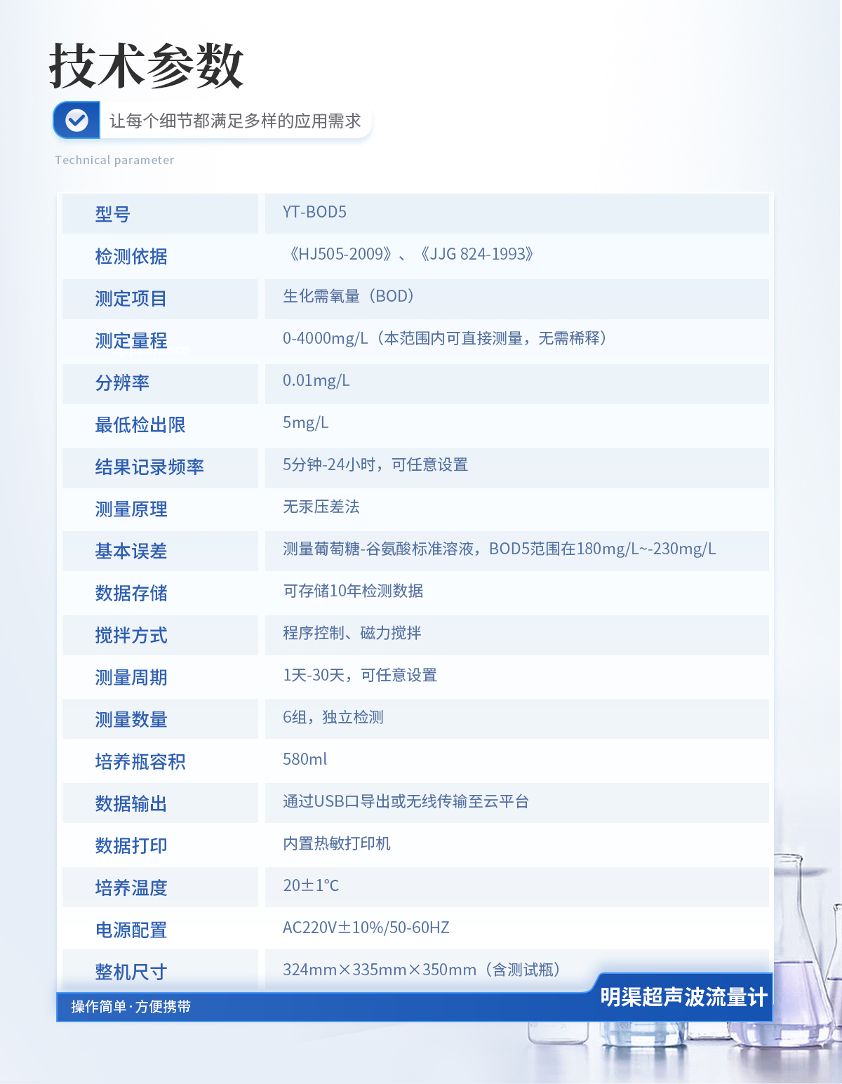 参考依据:《HJ505-2009》、《JJG 824-1993》; 测定项目:生化需氧量(BOD); 测定量程:0-4000mg/L(本范围内可直接测量,无需稀释); 分辨率:0.01mg/L; 结果记录频率:5分钟-24小时,可任意设置; 测量原理:无汞压差法; 基本误差:测量葡萄糖-谷氨酸标准溶液,BOD5范围在180mg/L~-230mg/L; 数据存储:可存储10年检测数据; 搅拌方式:程序控制、磁力搅拌; 测量周期:1天-30天,可任意设置; 测量数量:6组,独立检测; 培养瓶容积:580ml; 数据输出:通过USB口导出或无线传输至云平台; 数据打?。耗谥萌让舸蛴』?; 培养温度:20±1℃; 电源配置:AC220V±10%/50-60HZ; 整机尺寸:324x335x350mm(含测试瓶);