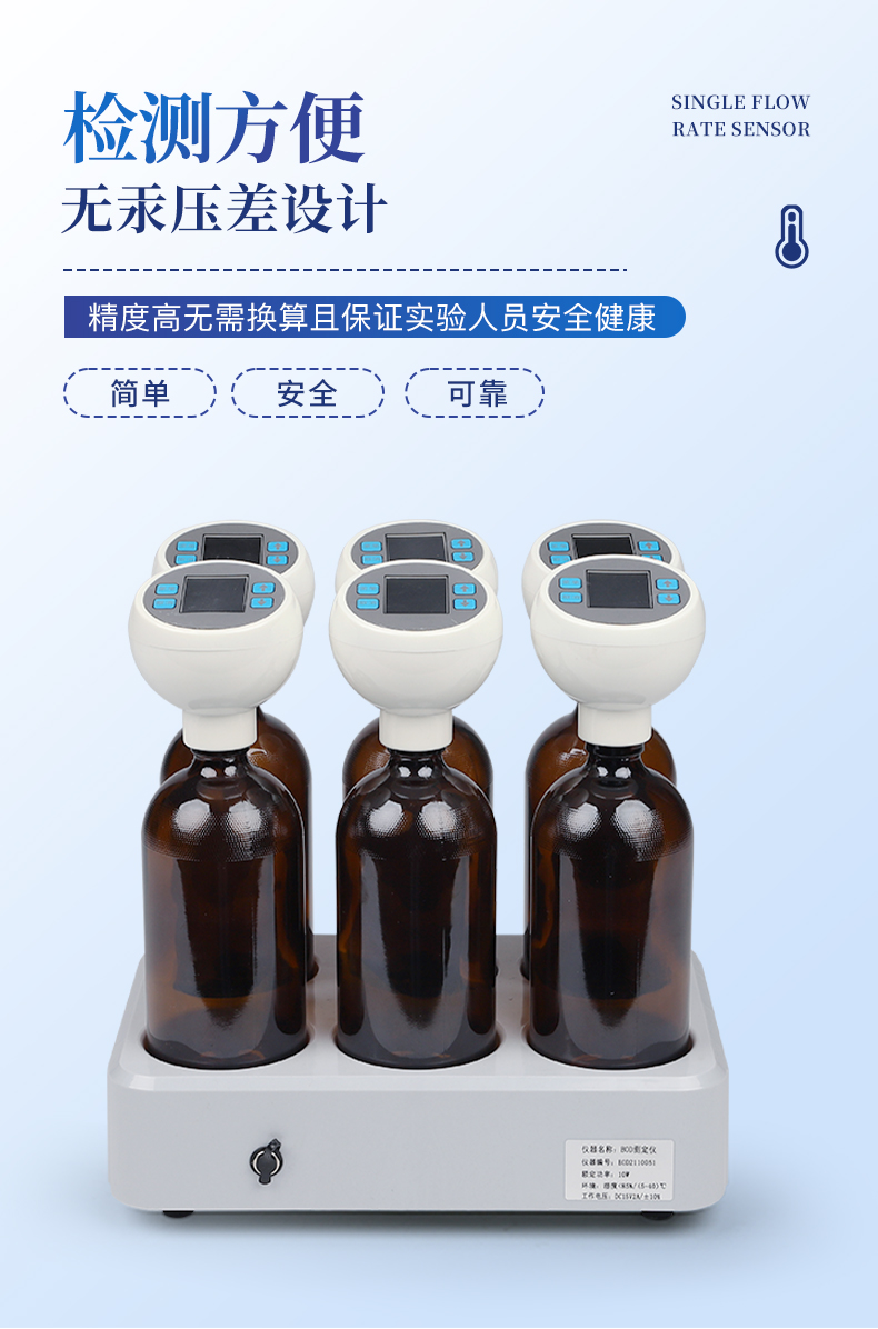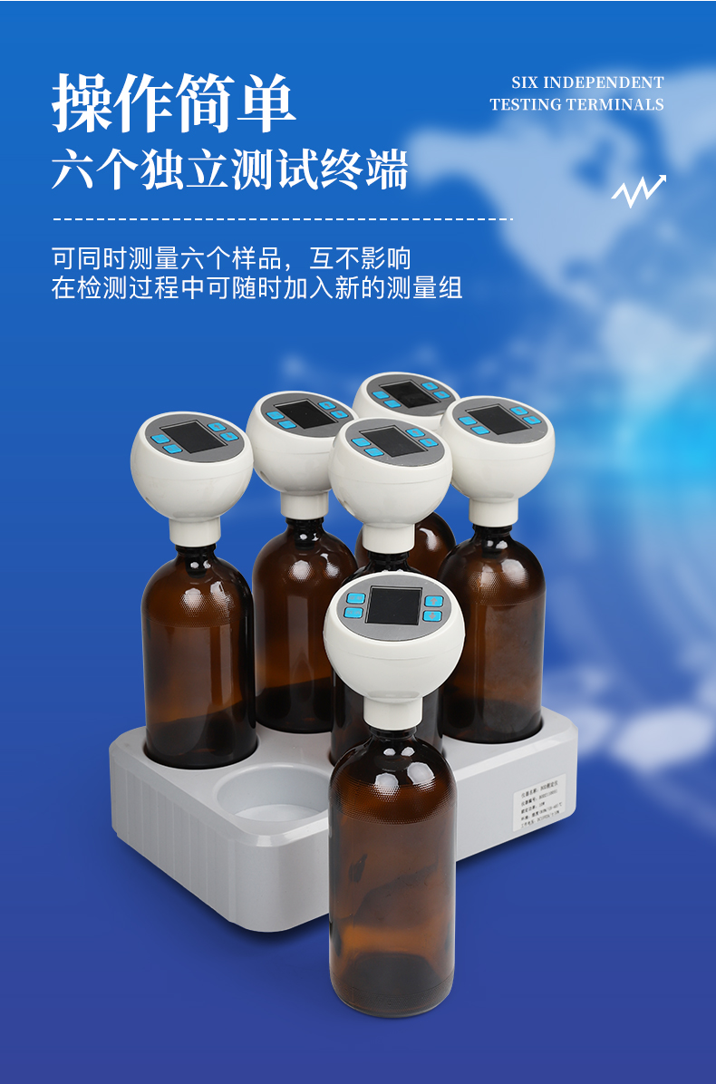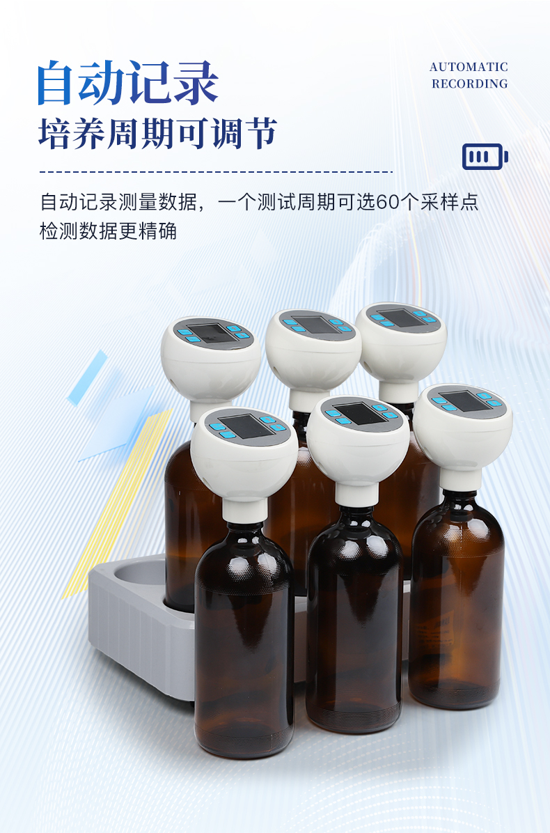 1. 可同时测量六个样品; 2. 六个独立测试终端,在检测过程中可随时加入新的测量组; 3. 直接读取BOD浓度值、无需计算; 4. 无汞压差设计,精度高,无需换算,且保证实验人员安全健康; 5. 实验环节无管路设计,避免管路老化、漏气等弊端; 6. 测量范围可选择,在水样浓度低于4000g/L时,无需稀释; 7. 测定仪自动记录测量数据,一个测试周期可选60个采样点、检测数据更**; 8. 培养周期可调节,根据需求可以选择; 9. 自动完成测量过程,无需专人值守; 10. 大尺寸液晶显示屏,直观明了,项目选择方便; 11. 测试终端自带大容量电池,电池寿命2年以上,测试过程中不受外部环境短期断电影响; 12.记录频率2h记录一次.