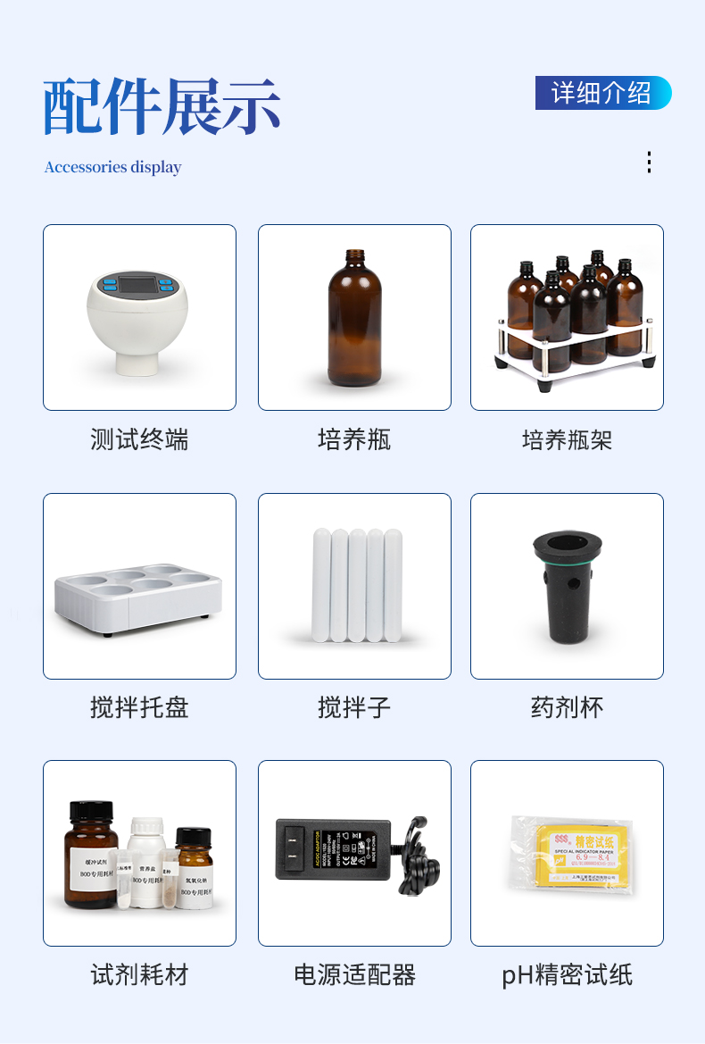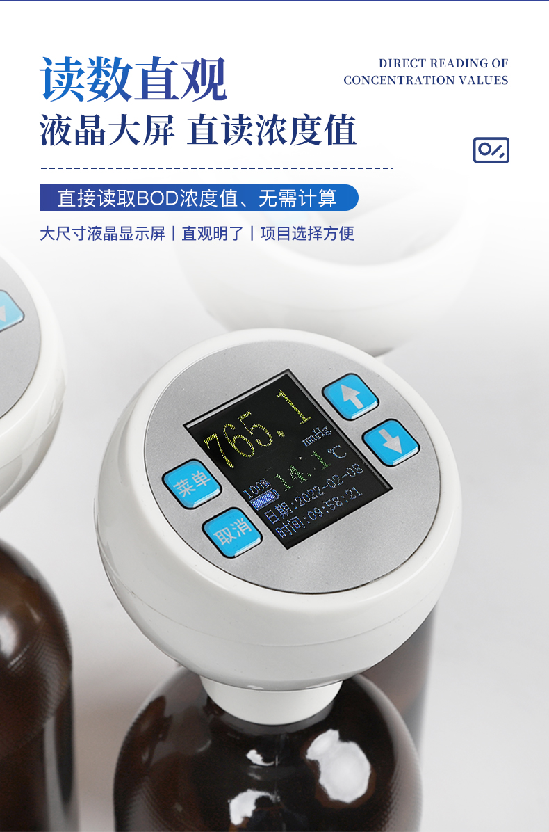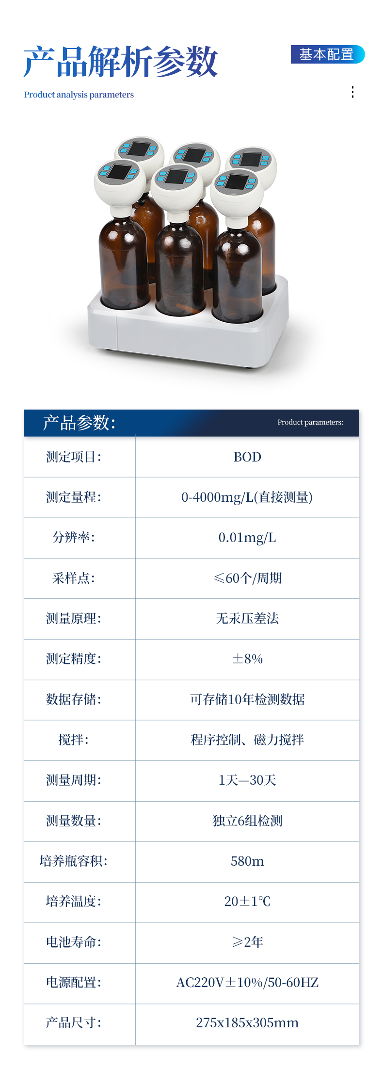 测定项目:BOD 测定量程:0-4000mg/L(直接测量) 分辨率:0.01mg/L 采样点:≤60个/周期 测量原理:无汞压差法; 测定精度:±8% 数据存储:可存储10年检测数据 搅拌:程序控制、磁力搅拌 测量周期:1天--30天 测量数量:独立6组检测 培养瓶容积:580ml 培养温度:20±1℃ 电池寿命:≥2年 电源配置:AC220V±10%/50-60HZ 产品尺寸:275x185x305mm