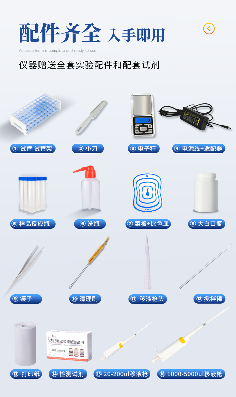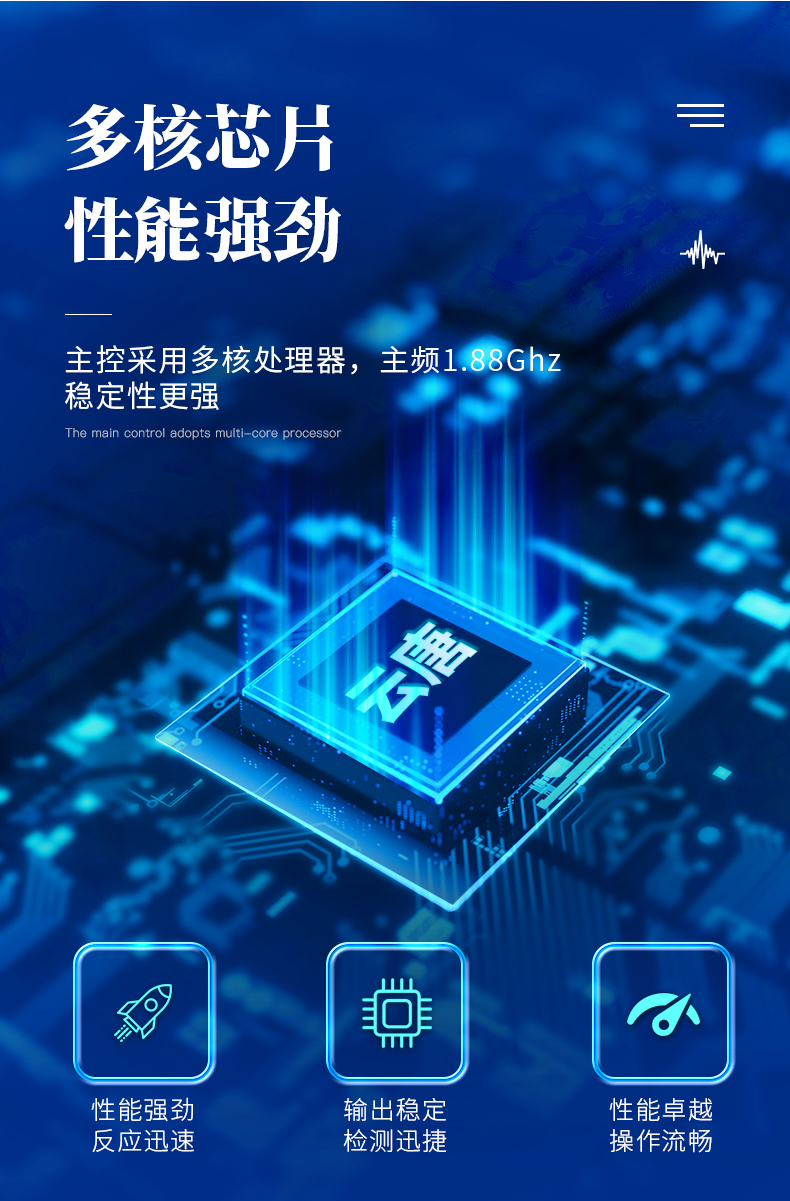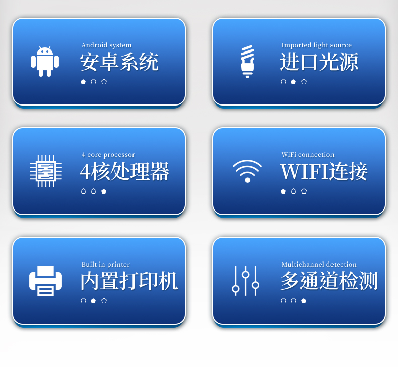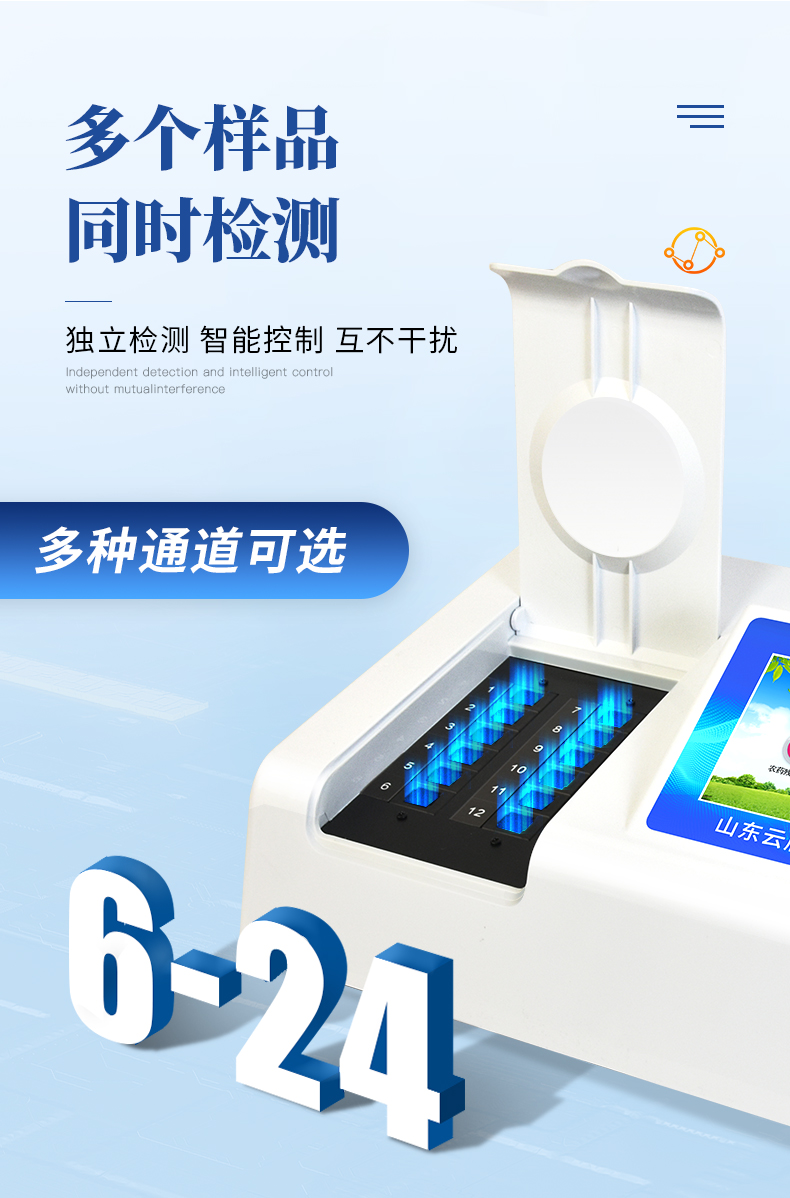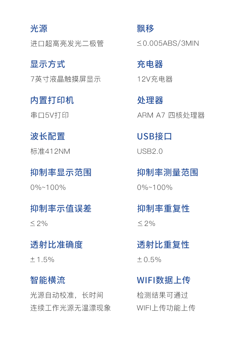 | 主控芯片采用ARM Cortex-A7,RK3288/4核处理器,主频1.88Ghz,运转速度更快速,稳定性更强。 | 显示方式:7英寸液晶触摸屏显示,人性化中文操作界面,读数直观、简单。 | 直流12V供电,可连接车载电源,可配6ah大容量充电锂电池,方便户外流动测试。 | 智能恒流稳压,光强自动校准,长时间连续工作光源无温漂现象。 | 不间断进样,连续检测 | 样本编号自动累加。 | 检测项目可扩充。 | 检测结果可批量打印,批量上传。 | 检测结果为Excel表格,连接电脑即可拷贝。 | 可配置大容量锂电池,固件可升级 |
