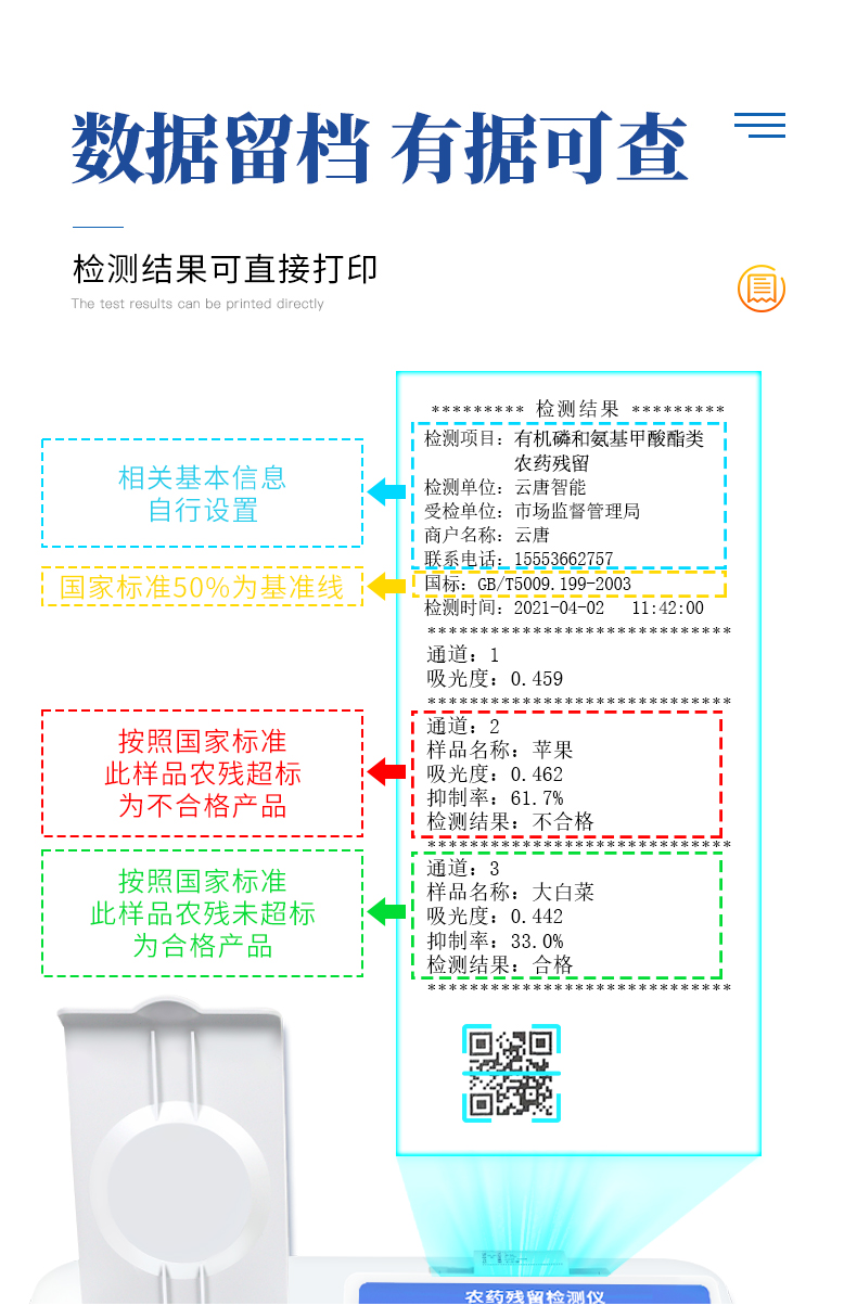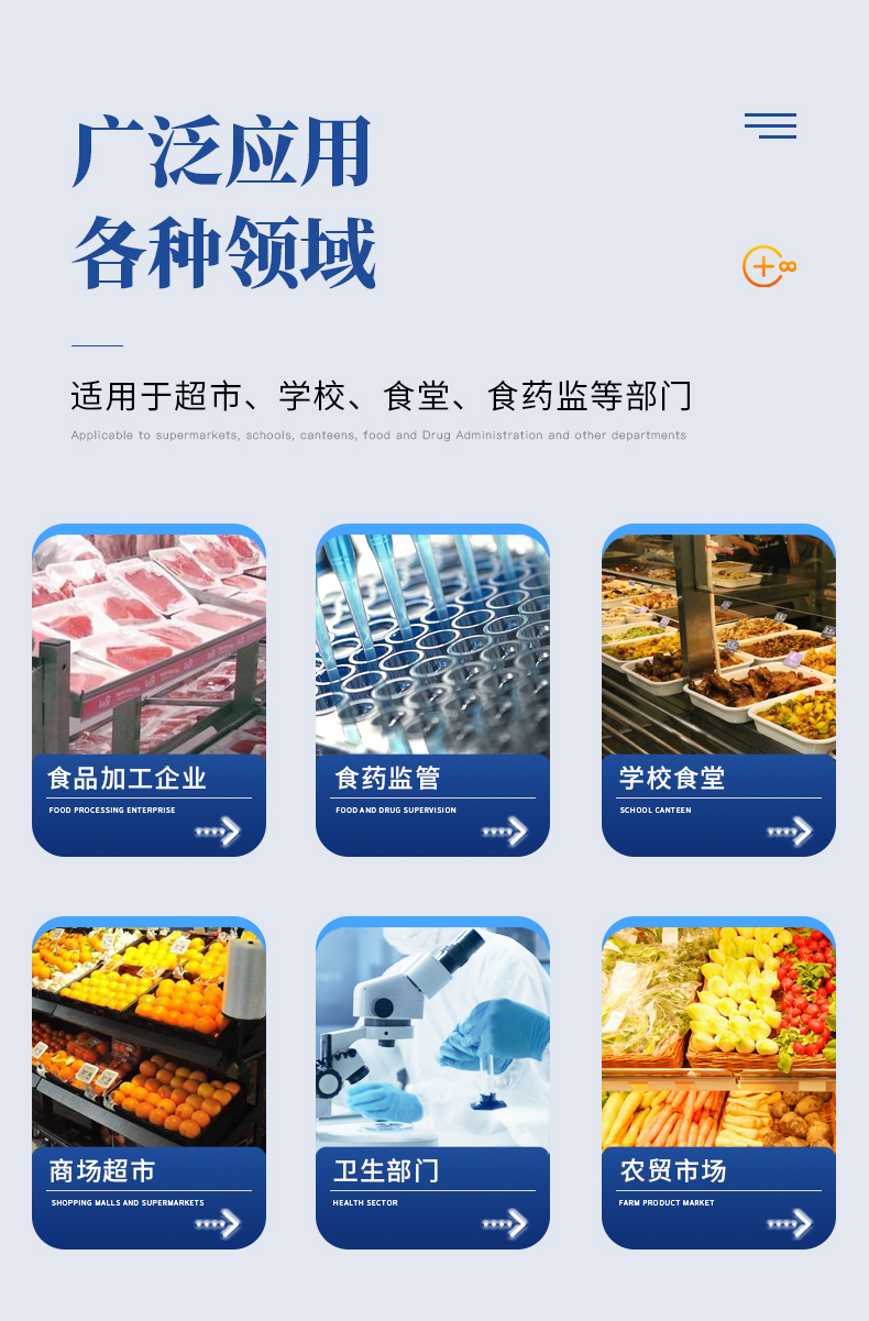| 安卓智能操作系统,采用更加**和人性化操作,仪器具有网线连接、wifi联网上传、GPRS无线远传功能,快速上传数据。 | 智能化程度高,仪器具有自检功能:具有开机自检和调零功能,具有自动检测重复性功能。 | 检测通道:≥12个检测通道,可以同时测试多个样品,每个样品由程序控制分别独立工作,不会互相干扰。 | 配备新一代嵌入式热敏打印机,可选择手动打印或者自动打印,检测完成可自动打印检测报告和二维码。 | 采用标准USB2.0接口设计,支持U盘存储,免驱动安装,方便数据的存贮和移动,并可随时与计算机直接相连,并且可用计算机控制仪器。实现数据查询、浏览、分析、统计、打印等。 | 仪器带有监管平台。检测结果可直接无线上传。进行数据分析处理,检测酒品等长短期动态,达到问题预估、预警。 | 仪器具有品类多种类样品菜单库,可灵活选择检测样品,不同的检测通道可同时检测不同的样品项目。 | 样品处理简单省力,整体操作快速、安全、便捷。 | 仪器具有自身?;すδ?,可设置用户名及密码,防止非工作人员操作等。 | 仪器具有重新校准、锁定、恢复出厂设置功能。 |