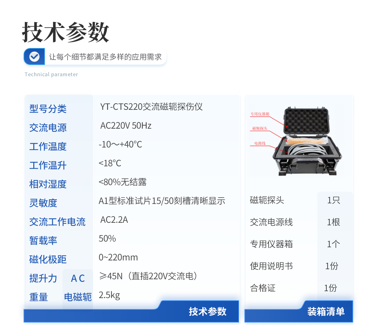 YT-CTS-N型电磁轭磁粉探伤仪,无主机设计,采用逆变交流锂电池供电,无需外接电源即可产生交流磁场。核心部分采用单片机控制,输出**、稳定??筛莨ぜ暮穸茸远髡涑龅缌鳎跎倭丝返缌鞔蠛头⑷鹊奈侍?。输出功率强劲,检测灵敏度高,操作方便,结构紧凑、布局合理、体积小巧、重量轻、携带方便等特点。