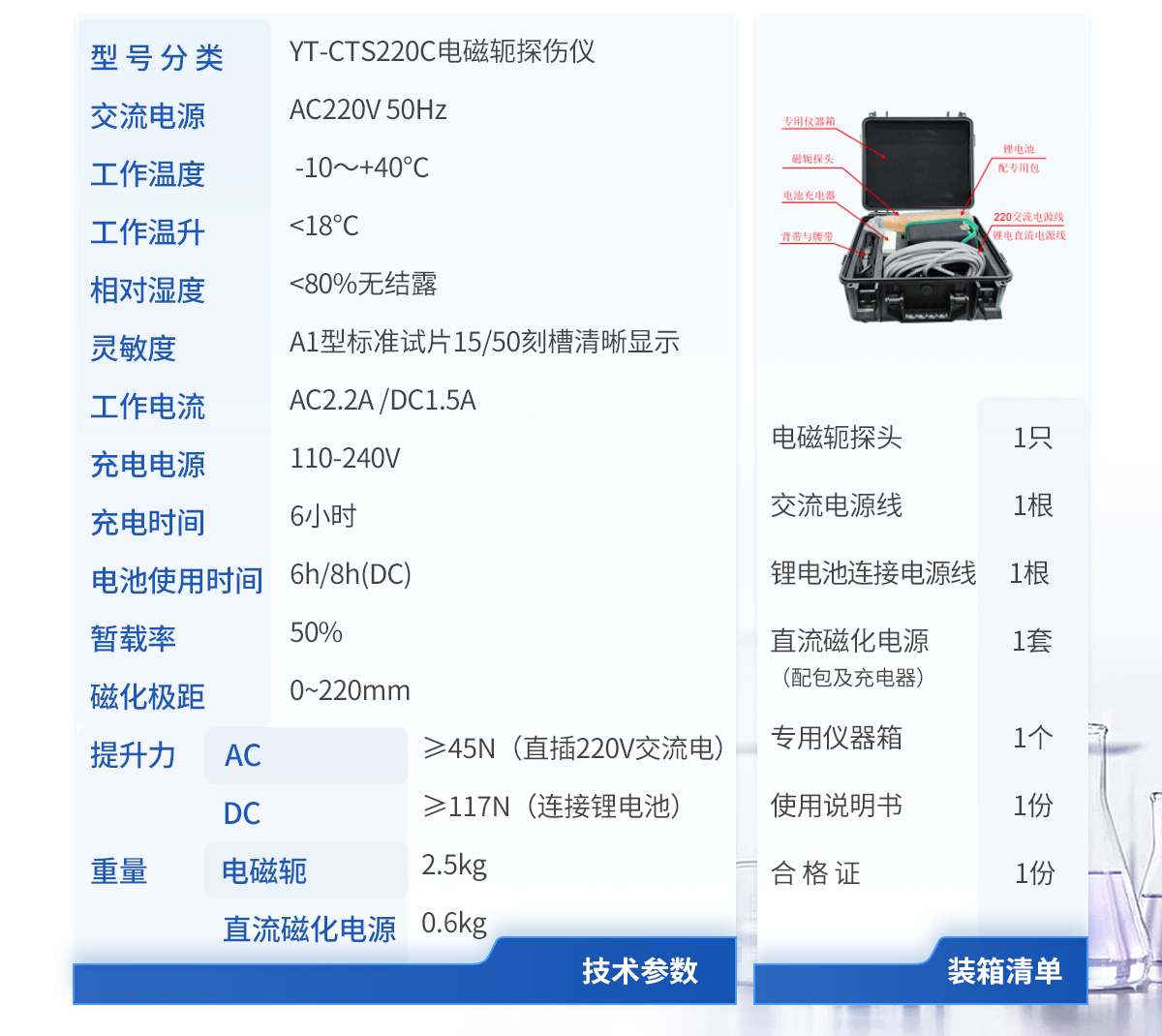 (1)电磁轭:2.5kg (2)交流磁化电源(锂电池):1kg |