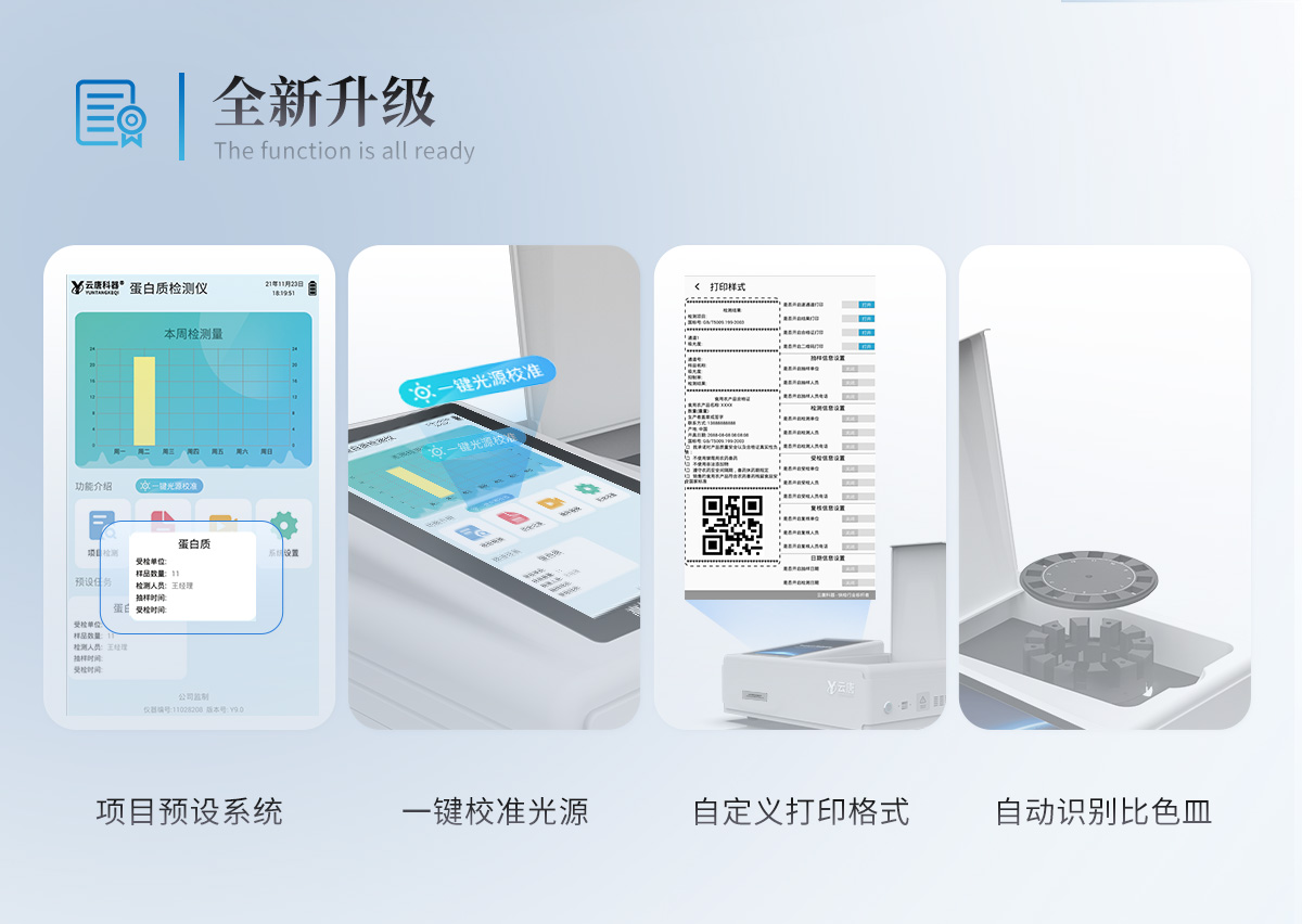 可快速检测奶粉、牛奶及乳制品中的蛋白质,仪器预留其他项目检测程序和端口,根据日后需求可方便的自主增加检测项目。
