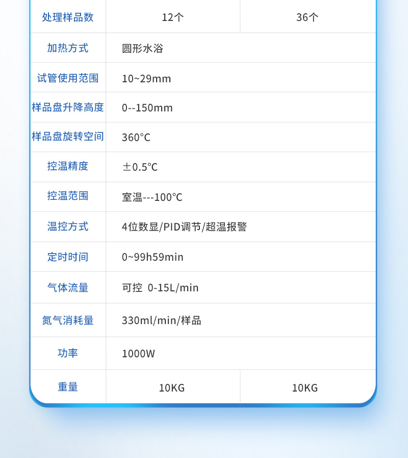 | 产品型号 | 处理样品数 | 孔径尺寸 | 氮气消耗量 | 气体流量计 | 标配加热块数 | 控温精度 | 控温范围 | 温控方式 | 外形尺寸 | 功率 | 重量 |