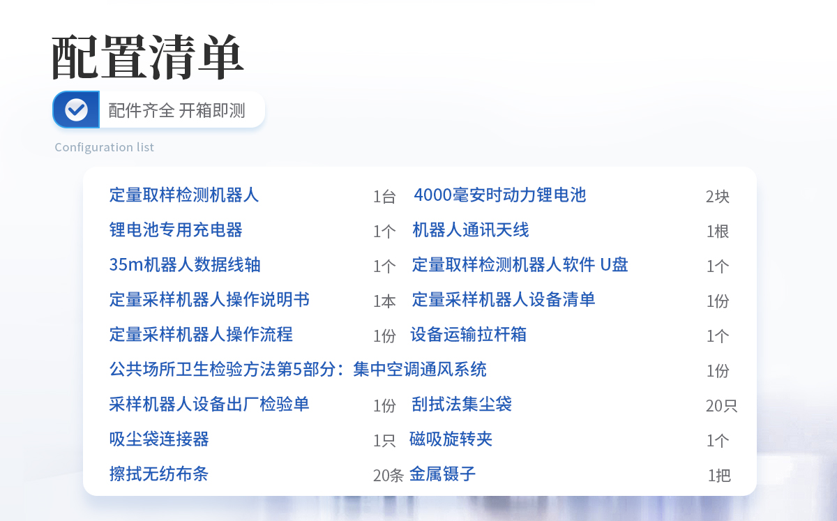 | 定量取样检测机器人:1台 | 4000毫安时动力锂电池:2块 | 锂电池专用充电器:1个 | 机器人通讯天线:1根 | 35m机器人数据线轴:1个 | 定量取样检测机器人软件 U盘:1个 | 定量采样机器人操作说明书:1本 | 定量采样机器人设备清单:1份 | 定量采样机器人操作流程:1份 | 公共场所卫生检验方法第5部分:集中空调通风系统:1份 | 采样机器人设备出厂检验单:1份 | 刮拭法集尘袋 :20只 | 吸尘袋连接器 :1只 | 磁吸旋转夹:1个 | 擦拭无纺布条 :20条 | 金属镊子:1把 | 设备运输拉杆箱:1个 |
