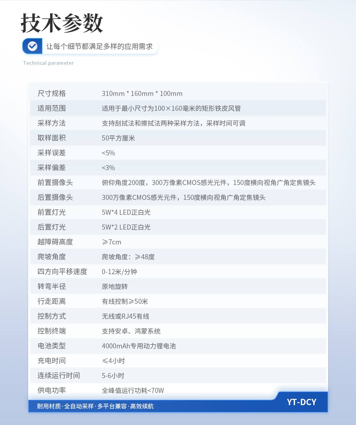 | 合规性:完全符合《WS 10013-2023》、《WS/T 10004-2023》及《GB 37488-2019》中对集中空调定量采样机器人的要求。 | 紧凑设计:尺寸长宽高310mm * 160mm * 100mm,可进入*小尺寸为100×160毫米的矩形铁皮风管内部进行采样。 | 精准采样:提供刮拭法和擦拭法两种采样方法,采样器取样面积50平方厘米,密闭双采样器加装气流回风道,并使用光固化3D打印技术制造,保障了采样面积的有效性。布条和拥有专利设计的刮板夹安装方便快捷,现场操作时可**限度地杜绝二次污染,实现无菌操作。采样误差小于5%,采样偏差小于3%。 | 全方位视野:前置摄像头俯仰角度达200度,前后均采用150度广角定焦摄像头,提供无死角视野。 | 灵活控制:支持无线与有线两种控制方式,有线控制距离≥50米,无线控制无距离限制。视频采集、拍照及机器人控制均由终端完成。 | 强大越障能力:越障碍高度≥7cm,爬坡角度≥48度,整机含电池工作重量仅为4.0KG。 | 全自动采样:软件控制加入了《集尘量采样》与《微生物采样》的全自动一键采样功能,无需人工干预即可完成所有采样动作。 | 耐用材质:整机不低于95%的材料使用航空铝合金,表面经过氧化喷砂处理并增厚钝化膜,增加表面硬度。机体行走??橐惶宄尚?,总重不超过4KG。 | 多平台兼容:支持安卓系统、鸿蒙系统的手机、平板、电脑进行控制操作。 | **续航:配备4000mAh容量的动力电池,充电时间≤4小时,单次充电后可持续运行约5-6小时。 |