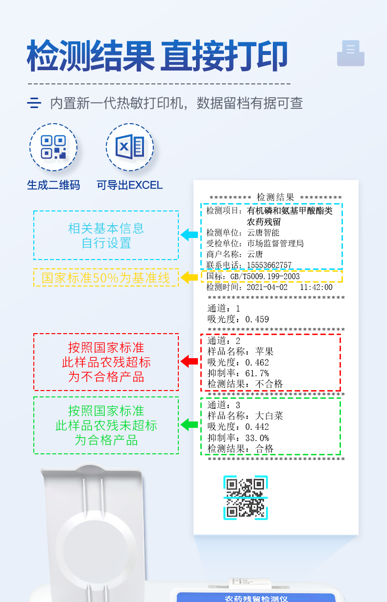 | 乙酰胆碱酯酶和丁酰胆碱酯酶试剂均可以使用,符合****和农业部标准的要求。 | 安卓智能操作系统,采用更加人性化操作,主控采用多核处理器,主频1.88Ghz,运转速度更快速,稳定性更强。 | 仪器具有4G无线远传、wifi联网上传、网线连接功能,快速上传数据,进行数据管理与统计。 | 自动判断样品是否合格,检测结果更加直观。 | 仪器具有100多种蔬菜名称菜单库,分类管理,并可按需添加或删除蔬菜名,编辑蔬菜名称,可直接打印出蔬菜名称。 | 检测通道:8个检测通道,可以同时测试多个样品,循环检测,即放即检,每个样品由程序控制分别独立工作,不会互相干扰。 | 显示方式:7英寸高灵敏真彩触摸屏显示,人性化中文操作界面,读数直观、简单。 | 新一代高速打印机,可同时打印二维码,打印格式为检测人姓名、吸光度差值、检测时间、检测机构、样品名称及结果判定。 | 光源采用进口超高亮发光二极管,具有低功耗、高精度、稳定性强、光源可控可以关掉不使用的光源,响应速度快等优点。 | 智能恒流稳压,光强自动校准,长时间连续工作光源无温漂现象。 | 采用USB2.0接口设计,方便数据的存贮和移动,并可随时与计算机直接相连,并且可用计算机控制仪器。实现数据查询、浏览、分析、统计、打印等。 | 智能化程度高,仪器具有自检功能,具有开机自检和调零功能,具有自动检测重复性功能 | 仪器具有自身?;すδ?,可设置用户名及密码,防止非工作人员操作等。 | 采用DC12v直流供电,安全系统更高,并且配备6A锂电池充电器。 | 仪器具有重新校准、锁定、恢复出厂设置功能。 |