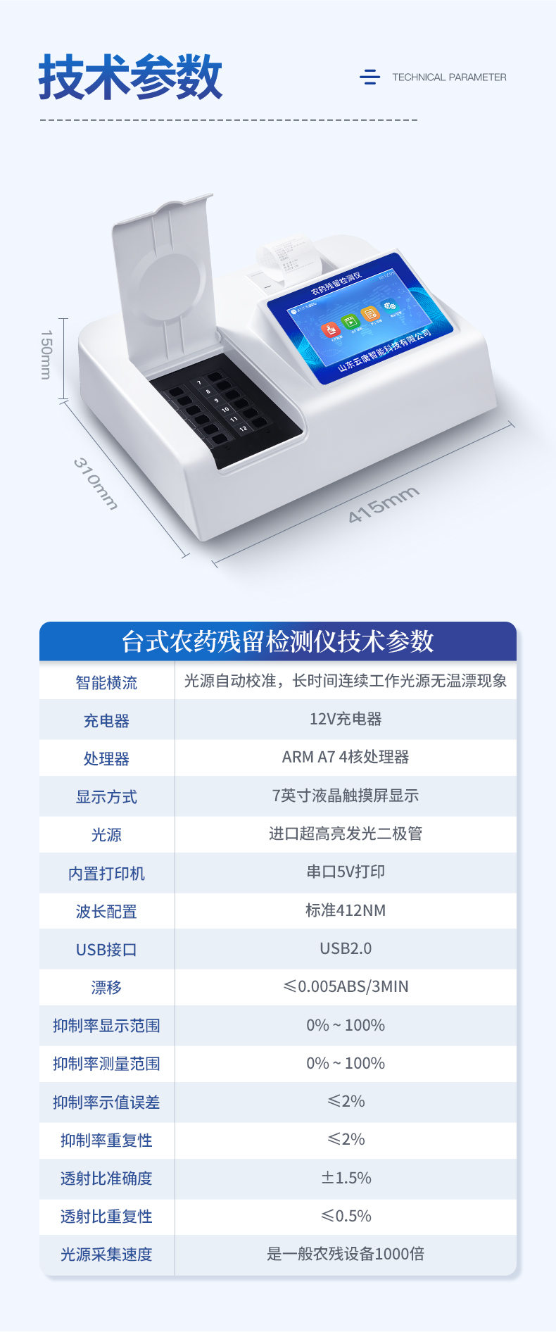 检测标准:依据****方法(GB/T5009.199-2003)以及世界卫生组织WHO、世界粮农组织FAO残留农药检测标准、世界环境?;ぞ諩PA参照摄入量等要求来设计。采用酶抑制率比色法对水果、蔬菜等农林产品中有机磷和氨基甲酸酯类农药含量进行快速准确的检测。
