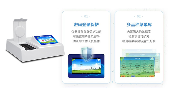 可快速检测各类食品中的甲醛、吊白块、二氧化硫、亚硝酸盐、双氧水、硼砂、农药残留、乳及乳制品中蛋白质、硝酸盐、重金属铅的含量,仪器预留其他项目检测程序和端口,根据日后需求可方便的自主增加检测项目。