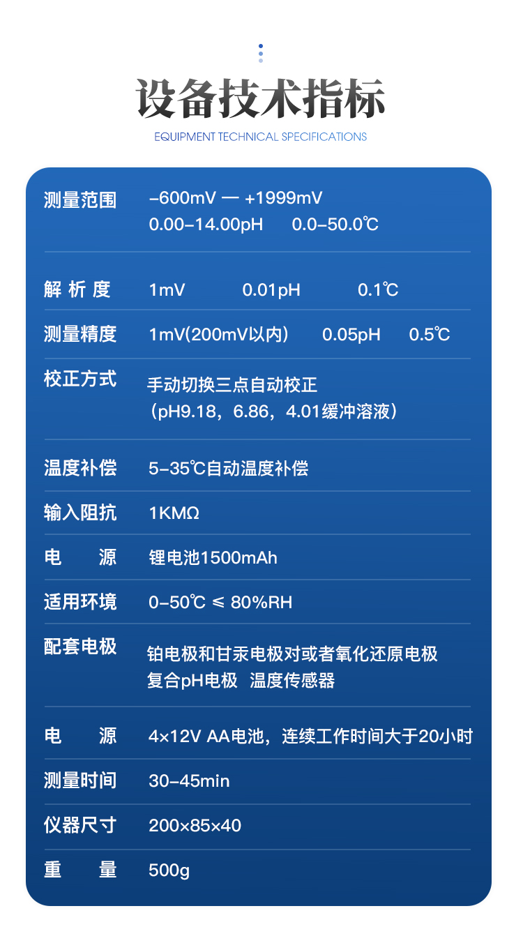 | 测量范围:-600mV — +1999mV 0.00-14.00pH 0.0-50.0℃ | 解 析 度:1mV 0.01pH 0.1℃ | 测量精度:1mV(200mV 以内) 0.05pH 0.5℃ | 校正方式:手动切换三点自动校正(pH9.18,6.86,4.01缓冲溶液) | 温度补偿:5-35℃自动温度补偿 | 输入阻抗:1KMΩ | 电 源:锂电池1500mAh | 适用环境:0-50℃ ≤ 80%RH | 配套电极:铂电极和甘汞电极对或者氧化还原电极 复合pH电极 温度传感器 | 电 源:4×12V AA电池,连续工作时间大于20小时 | 测量时间:30-45min | 仪器尺寸:200×85×40 | 重 量:500g |