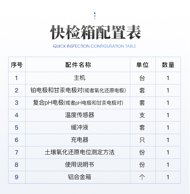 | 主机 1 台 | 铂电极和甘汞电极对(或者氧化还原电极) 1 套 | 复合pH电极(或者pH电极和甘汞电极对) 1 套 | 温度传感器 1 支 | 缓冲液 1 套 | 充电器 1 只 | 土壤氧化还原电位测定方法 1 份 | 使用说明书 1 份 | 铝合金箱 1 个 |