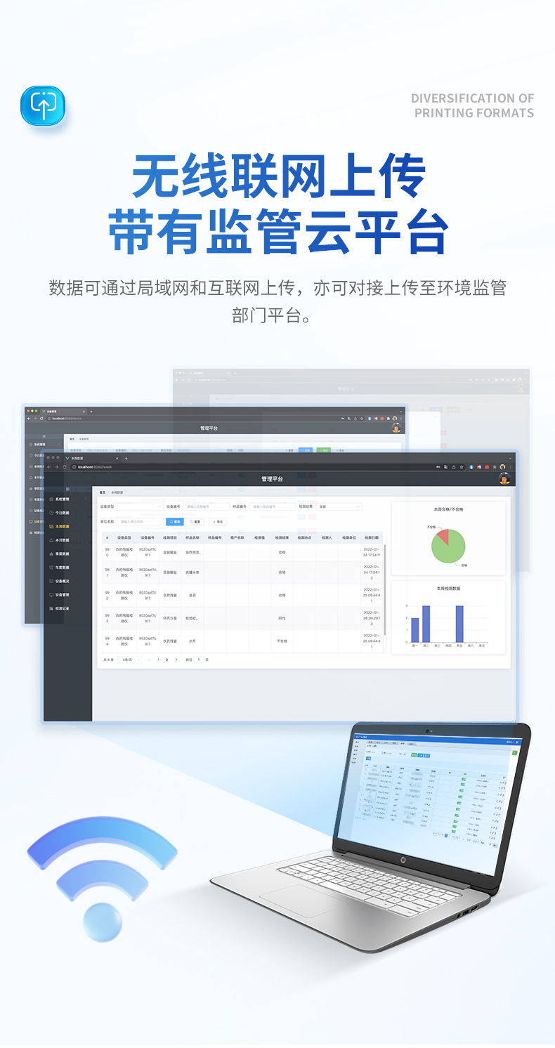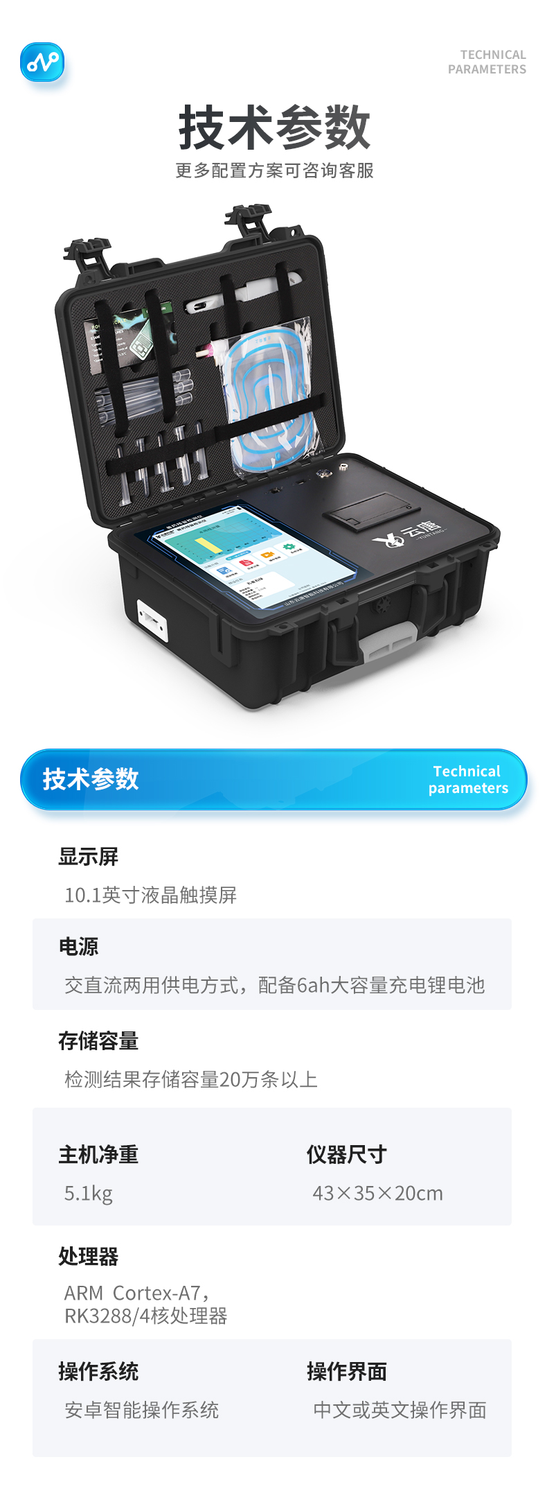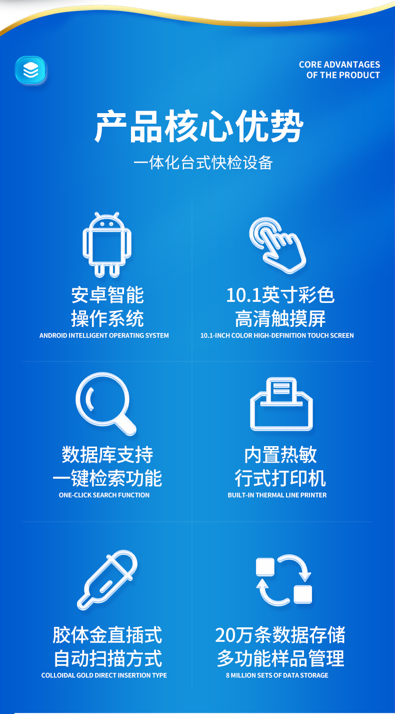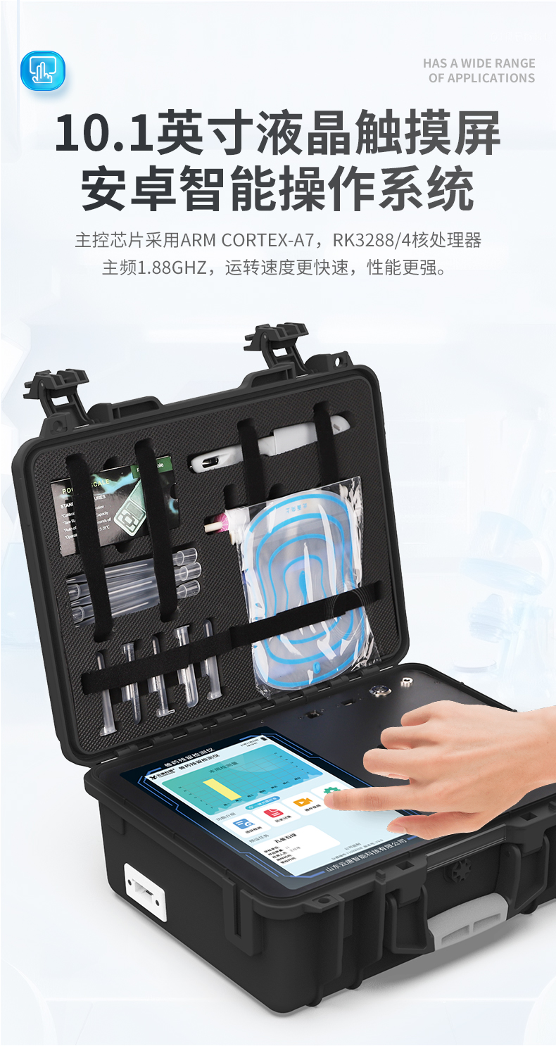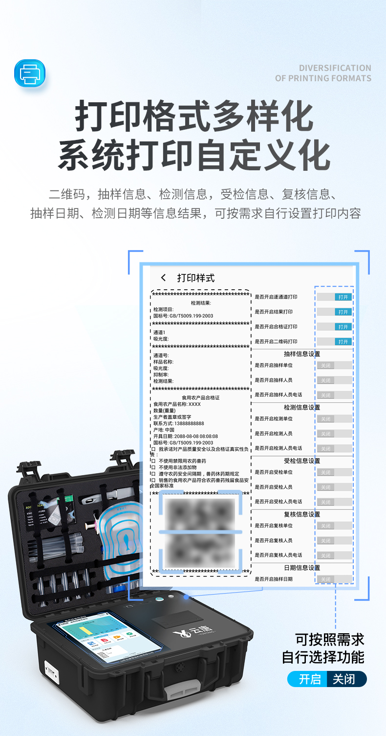| 1、仪器采用10.1英寸液晶触摸屏显,搭配运行安卓智能操作系统,主控芯片采用ARM Cortex-A7,RK3288/4核处理器,主频1.88Ghz,运转速度更快速,性能更强。 | 2、仪器功能包括:胶体金检测模块、数字化管理模块、无线通讯??榈龋梢月阃蝗砑率迪炙屑觳庀钅康募觳?,并在同一窗口展示检测结果。 | 3、一体化便携式快检设备,采用交直流两用供电方式,可连接车载电源,配备6ah大容量充电锂电池,可以满足现场及流动检测使用的需求。仪器尺寸:43×35×20cm, 主机净重:5.1kg | 4、系统自带数据集成???,设备首页自动统计检测数据包含:周检测数据、月检测数据,全部检测总数量,均包含检测总数,合格数,不合格数,以及相关柱形分析图,对各项检测数据清晰掌握,无需电脑查询,更加快捷直观。 | 5、仪器具有任务预设???,可在样品送检前提前预设样品名称、检测指标、送检单位等信息,样品送检时一键调取保存信息,检测更加方便快捷。 | 6、胶体金检测??椋? 轨道式自动传输扫描方式,可实时显示金标卡实时图像,系统自动分析并呈现出CT曲线图,CT线自动识别,无需手动调整,完成检测后自动退出检测卡。 结果判定线可修改,对照值标定值可保存,断电不丢失数据。 兼容市场上其他胶体金卡,使用耗材不受限制,极大增强用户使用体验。 | 7、图像调整功能:可根据金标卡读取图像进行多方位调整,使其更精准读取结果。 | 8、仪器检测系统拥有庞大数据库,并且构建了完善的检索、修订功能。食品库涵盖多种样品名称,可按需添加或删除、编辑样品名称;产品数据库以及历史检测记录支持一键检索功能。 | 9、系统打印自定义化,打印格式多样化,产品合格证(****要求),二维码,抽样信息、检测信息,受检信息、复核信息、抽样日期、检测日期等信息结果,可按需求自行设置打印内容。 | 10、A4纸版本报告打印功能:设备拥有两种结果展示方式,可以自动生成A4打印模板和小票打印模板两种样式,可通过WiFi及网线等方式链接外置打印机可进行打印 | 11、仪器具有 wifi 联网上传、RJ45网线连接功能,可以快速上传数据。同步对接监管平台,数据可局域网和互联网数据上传,检测结果直接传至食品安全监管平台。进行区域食品安全监管及大数据分析处理与数据统计,检测区域食品安全长短期动态,达到食品安全问题预估、预警。 | 12、设备支持U盘存储,标准USB接口,免驱动安装。检测结果存储容量20万条以上,可生成Excel表格,进行一键拷贝,并具有登录?;すδ埽缮柚糜没懊苈?,规范不同人员操作权限,防止非工作人员操作,并且可以进行重新校准、锁定、恢复出厂设置功能。仪器固件可升级,后期检测项目可扩充。 | 13、仪器具备远程升级功能,可定向分客户分仪器更新,开机后自动更新,并可持续性免费更新系统版本,无需像传统产品返厂更新,节省时间及人力成本并避免了物流运输返厂升级导致设备损坏的潜在风险。 |