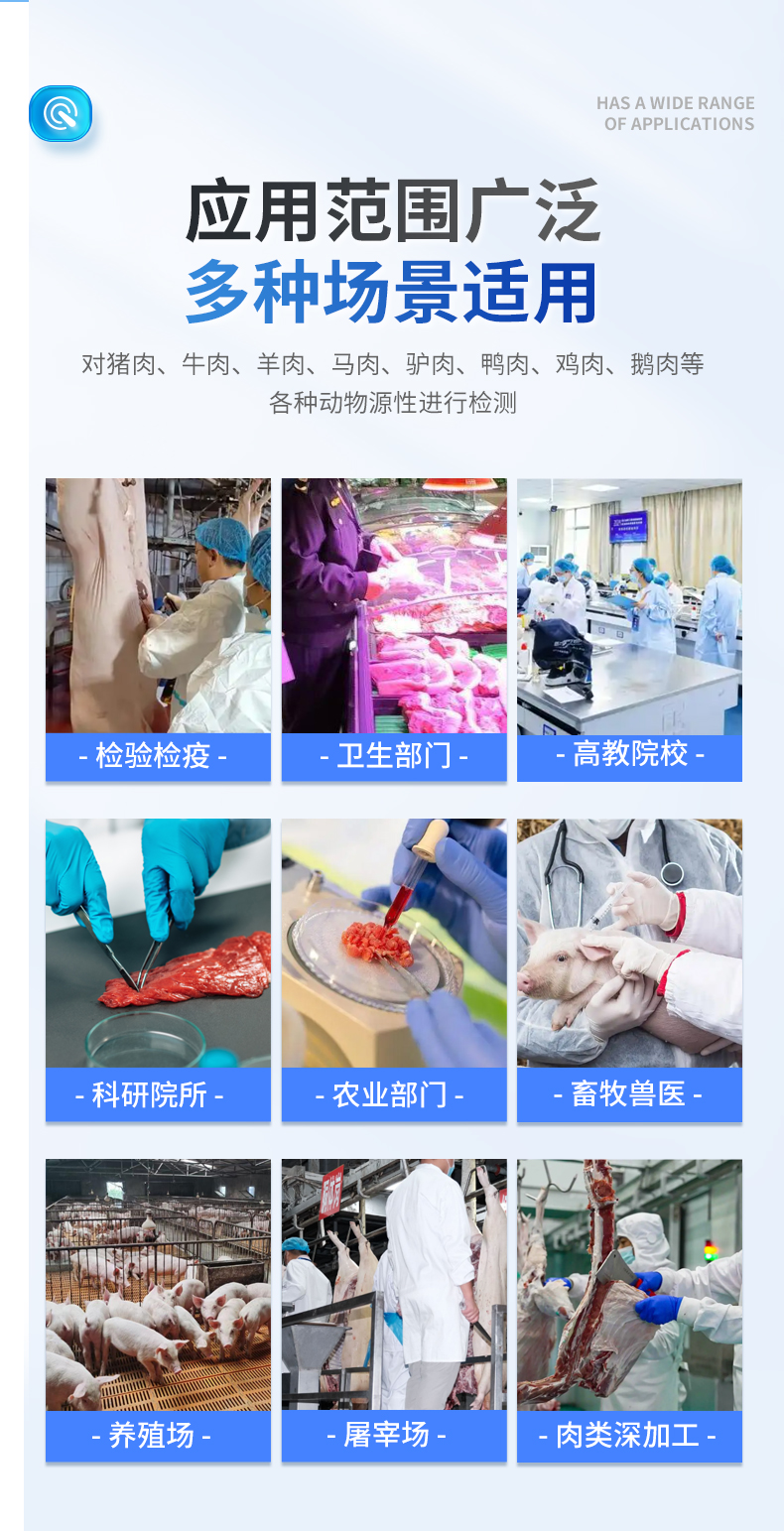该仪器是一款**、便捷的食品检测设备,专为识别肉类的真假而设计??梢远灾砣?、牛肉、羊肉、马肉、驴肉、鸭肉、鸡肉、鹅肉等各种动物源性进行检测。能够迅速、准确地检测肉类及肉源性种类,确保所食用的肉类真实可靠。检测迅速准确,为各检测单位提供专业的服务。