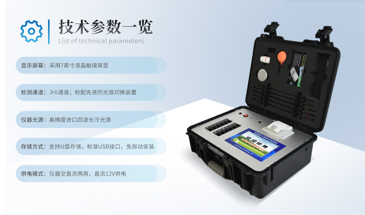 | 升级款,喷塑钢板外壳设计,坚固耐用,配套成套附件及成品药剂。 | 微电脑控制,数字化线路、程序化设计,液晶显示,交直流两用,可野外流动测试。 | 分辨率:0.001,触摸式按键,内置新一代热敏打印机,可打印测试结果。 | 肥料养分专用检测仪可检测化肥、有机肥(含叶面肥、水溶肥、喷施肥等)中的速效氮、速效磷、有效钾、全氮、全磷、全钾、有机质、酸碱度,钙、镁、硫、铁、锰、硼、锌、铜、氯、硅等各种中微量元素以及铅、铬、镉、汞、砷等各种重金属含量。 | 采用高亮LED灯光源、双拨轮滤光式处理技术,保证光源波长稳定, 硅半导体作为信号接收系统,寿命长达10万小时级别。光源稳定,重现性好,准确度高。 | 比色槽部分采用单通道设计,无机械位移及磨损,光路测试定位**,保证测定结果精度。 | 采用自主分析方法(号:** 2018 2 1777724.7),保证检测结果绝对达到国标要求。 | 内置热敏打印机,肥料打印结果为百分含量,测试误差小于0.5%。 |