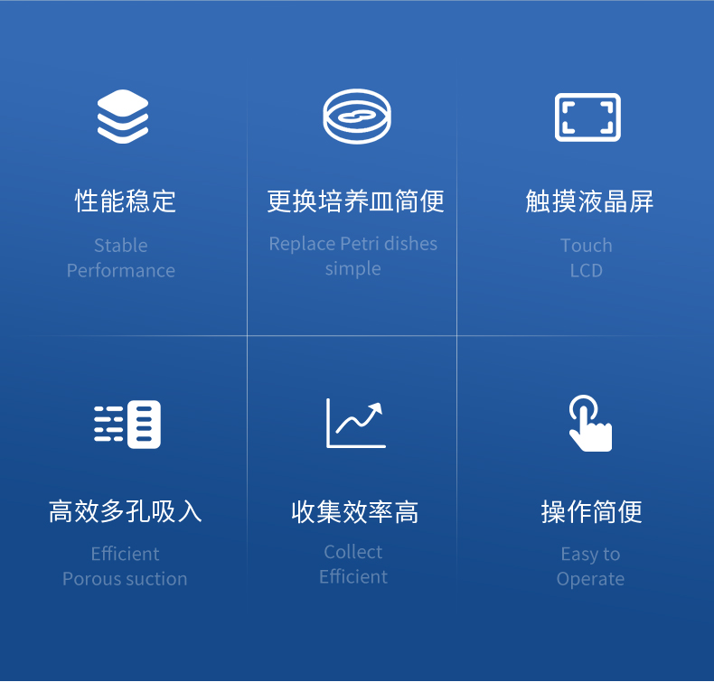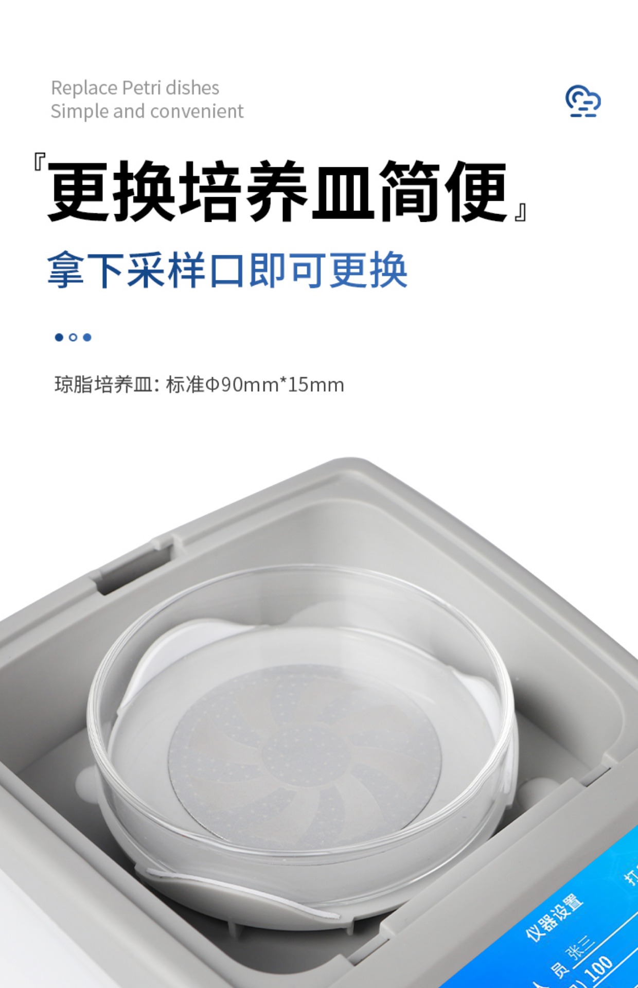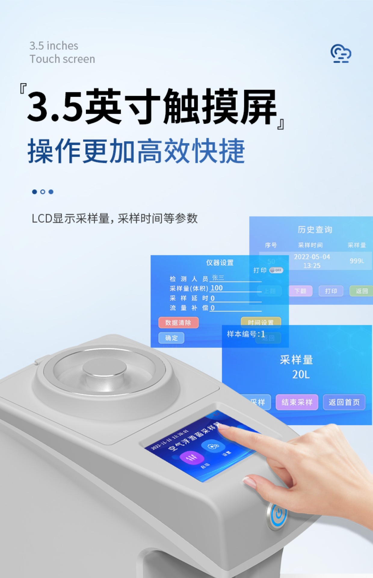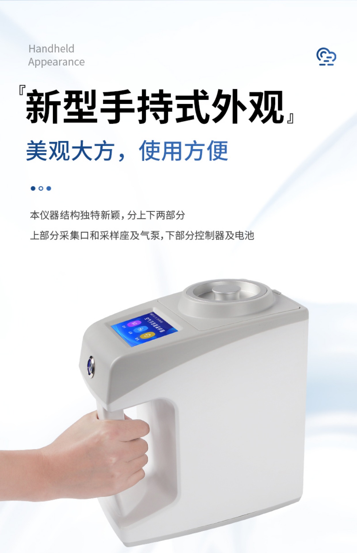 | 新型手持式外观,美观大方,使用方便。 | 彩色触屏控制,操作更加**快捷。 | LCD显示采样量,采样时间等参数。 | 可将采样量,采样时间等参数按组储存。 | 更换培养皿简便,拿下采样口即可更换培养皿。 | 带上位机软件,数据可导出电脑,方便历史分析。 | 交直流两用,内置6000mAh大容量锂电池,可连续采样8小时。 | 程序支持中英文切换。 |