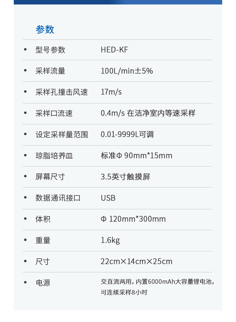 | 采样流量:100L/min±5% | 采样孔撞击风速:17m/s | 采样口流速:0.4m/s 在洁净室内等速采样 | 设定采样量范围:0.01-9999L可调 | 琼脂培养皿:标准? 90mm*15mm | 屏幕尺寸:3.5寸触摸屏 | 数据通讯接口:USB | 体积:Φ 120*300 | 重量:1.6kg | 尺寸:22×14×25cm |