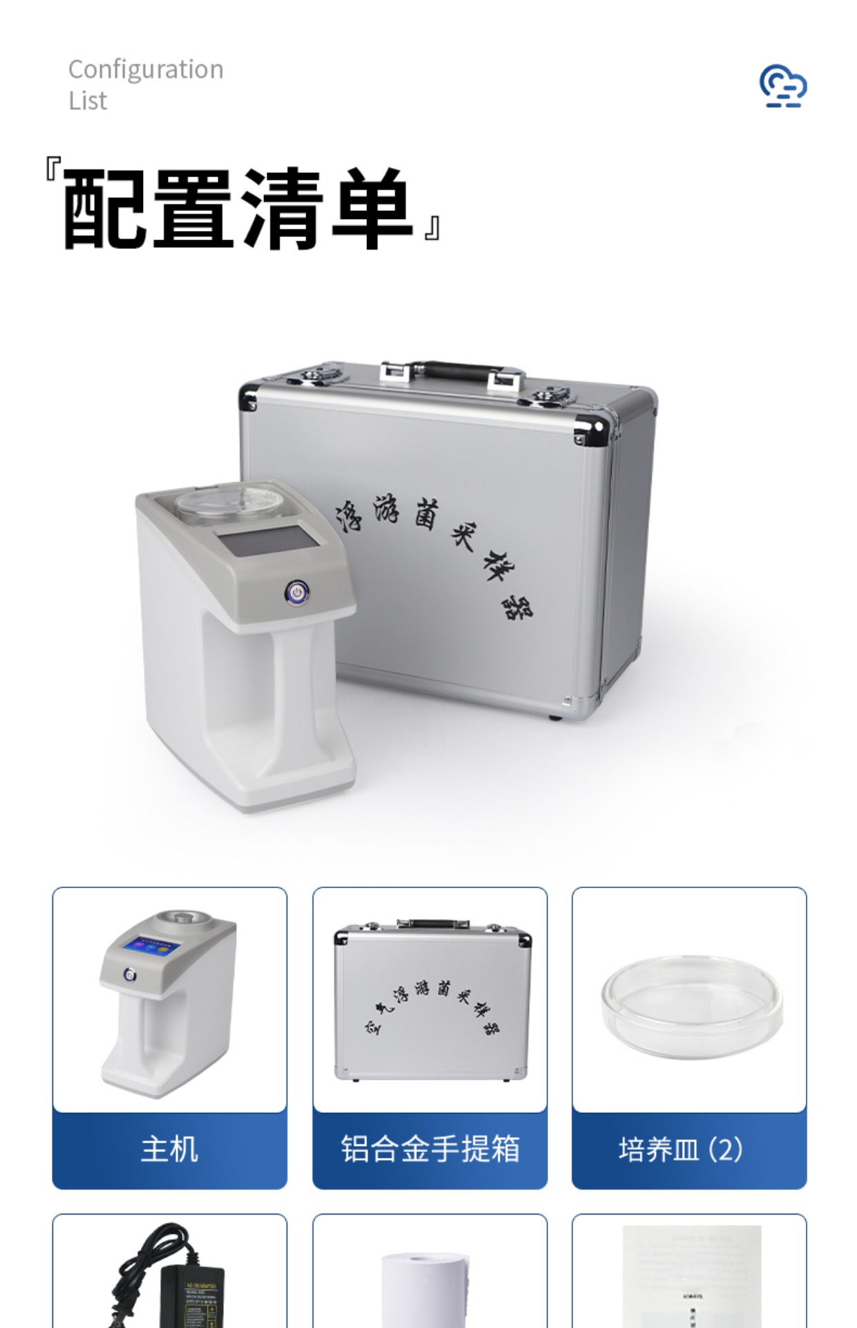 标准配件:采样盖1个,培养皿2个,防尘罩1个,热敏打印纸1卷,电源适配器,说明书,合格证