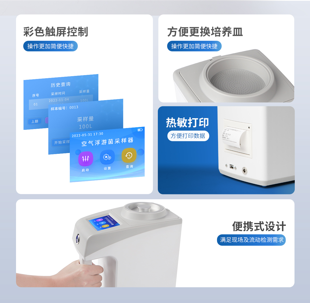 ●新型手持式外观,美观大方,使用方便。 ●彩色触屏控制,操作更加**快捷。 ●LCD显示采样量,采样时间等参数。 ●可将采样量,采样时间等参数按组储存。 ●更换培养皿简便,拿下采样口即可更换培养皿。 ●带热敏打印机,方便打印数据。 ●带上位机软件,数据可导出电脑,方便历史分析。 ●交直流两用,内置6000mAh大容量锂电池,可连续采样8小时。 ●程序支持中文或英文。