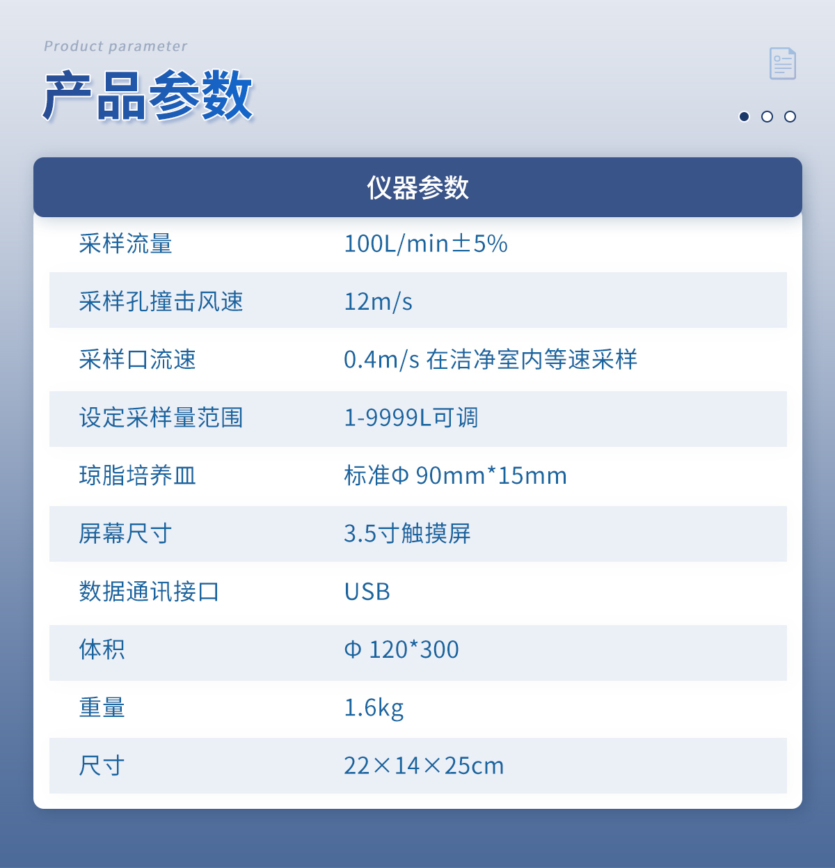 采样流量:100L/min±5% 采样孔撞击风速:12m/s 采样口流速:0.4m/s 在洁净室内等速采样 设定采样量范围:1-9999L可调 琼脂培养皿:标准? 90mm*15mm 屏幕尺寸:3.5寸触摸屏 数据通讯接口:USB 体积:Φ 120*300 重量:1.6kg 尺寸:22×14×25cm