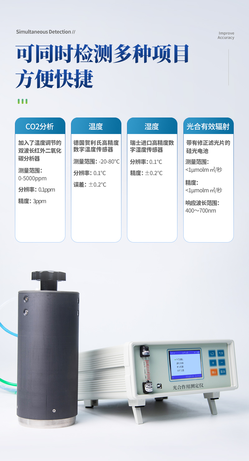 光合作用测定仪采用闭路测量方法可以测定气体CO2浓度、空气温湿度,植物叶片温度,光强,气体流量等要素,并计算出植物的光合速率、蒸腾速率、细胞间CO2浓度、气孔导度、水分利用率等光合作用指标,在生物、农学、园艺、林业、昆虫、微生物、动物等许多专业的实验课程中有广泛的利用前景.