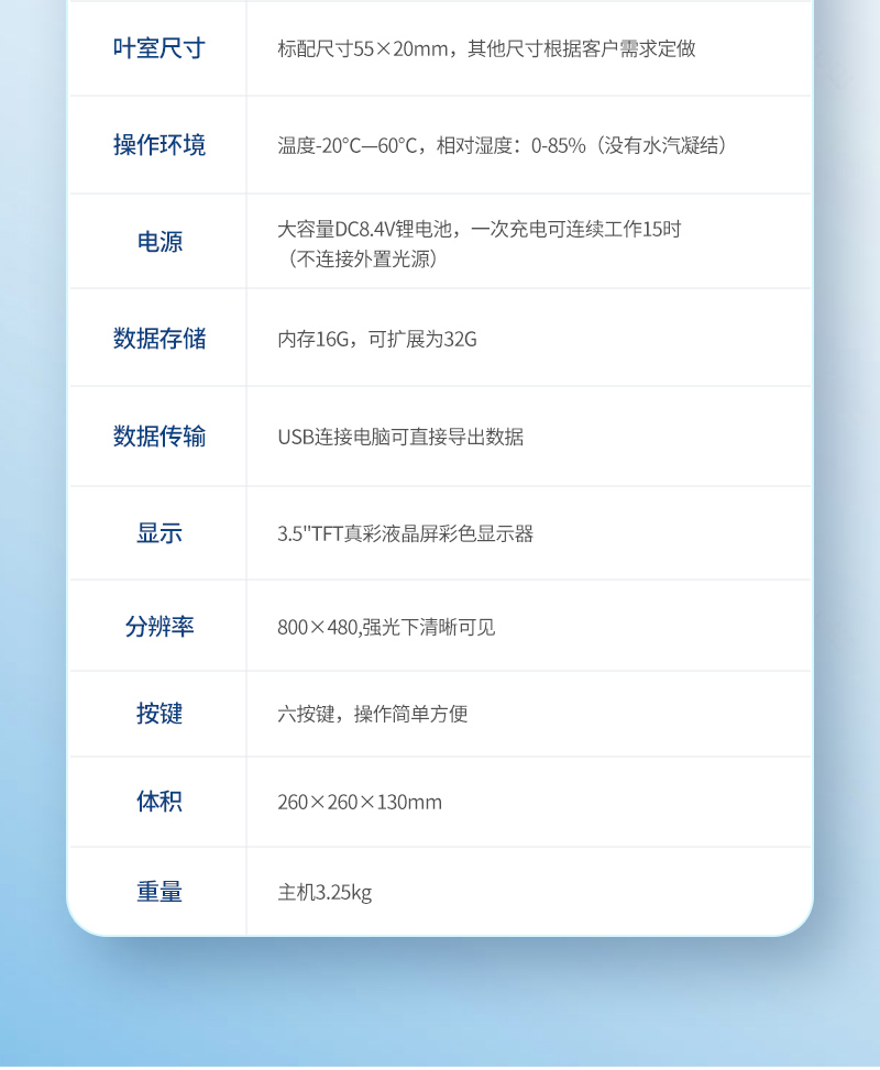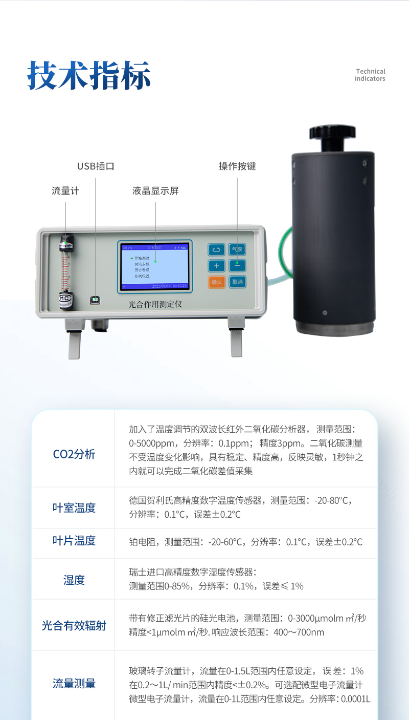 | CO2分析:加入了温度调节的双波长红外二氧化碳分析器, 测量范围:0-3000ppm,分辨率:0.1ppm; 精度3ppm。二氧化碳测量不受温度变化影响,具有稳定、精度高,反映灵敏,1秒钟之内就可以完成二氧化碳差值采集 | 叶室温度:德国贺利氏高精度数字温度传感器,测量范围:-20-80℃,分辨率:0.1℃,误差±0.2℃ | 叶片温度:铂电阻,测量范围:-20-60℃,分辨率:0.1℃,误差±0.2℃ | 瑞士进口高精度数字湿度传感器:测量范围0-85%,分辨率:0.1%,误差≤ 1% | 光合有效辐射(PAR):带有修正滤光片的硅光电池 | 测量范围:0-3000μmol·m -2·s-1,精度<5μmol·m -2·s-1. 响应波长范围:400~700nm | 流量测量:玻璃转子流量计,流量在0.2-1.5L范围内任意设定, 气流稳定,误 差:1%;在0.2~1L/ min范围内精度:0.2% | 叶室尺寸:标配尺寸55×20mm,其他尺寸根据客户需求定做 | 操作环境:温度-20℃—60℃,相对湿度:0-85%(没有水汽凝结) | 电源:大容量DC8.4V锂电池,一次充电可连续工作15时(不连接外置光源) | 数据存储:内存2G??衫┱刮?6G。 | 数据传输:USB连接电脑可直接导出数据。 | 显示:3.5"TFT真彩液晶屏彩色显示器,分辨率 800×480,强光下清晰可见 | 体积:260×260×130mm | 重量:主机3.25kg |