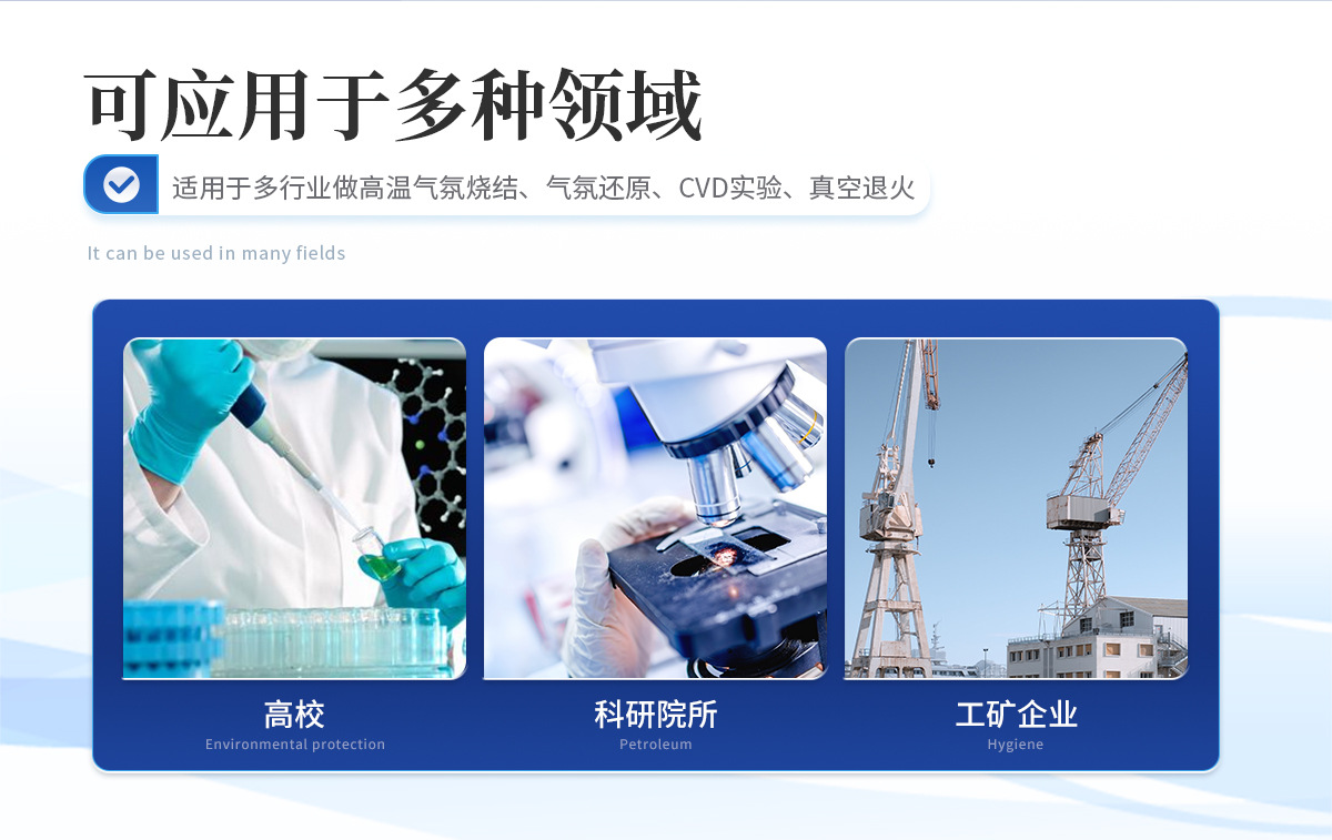 用于高校、科研院所、工矿企业做高温气氛烧结、气氛还原、CVD实验、真空退火等。