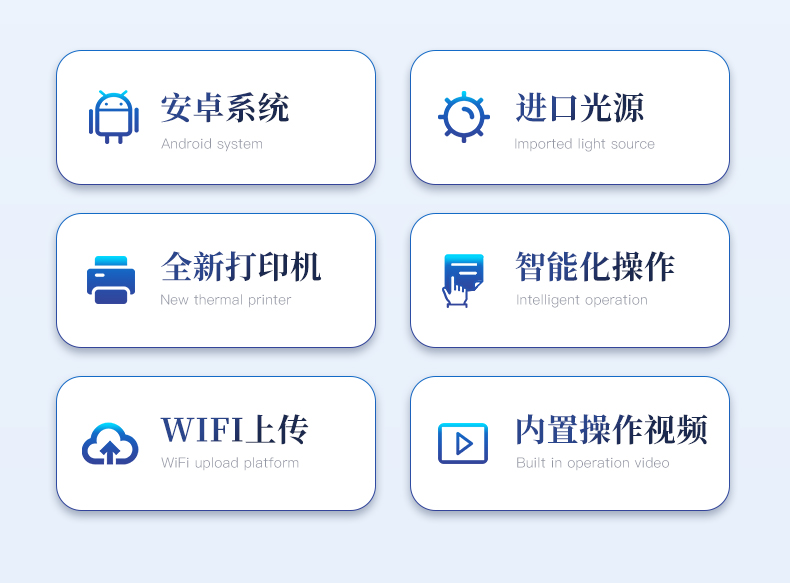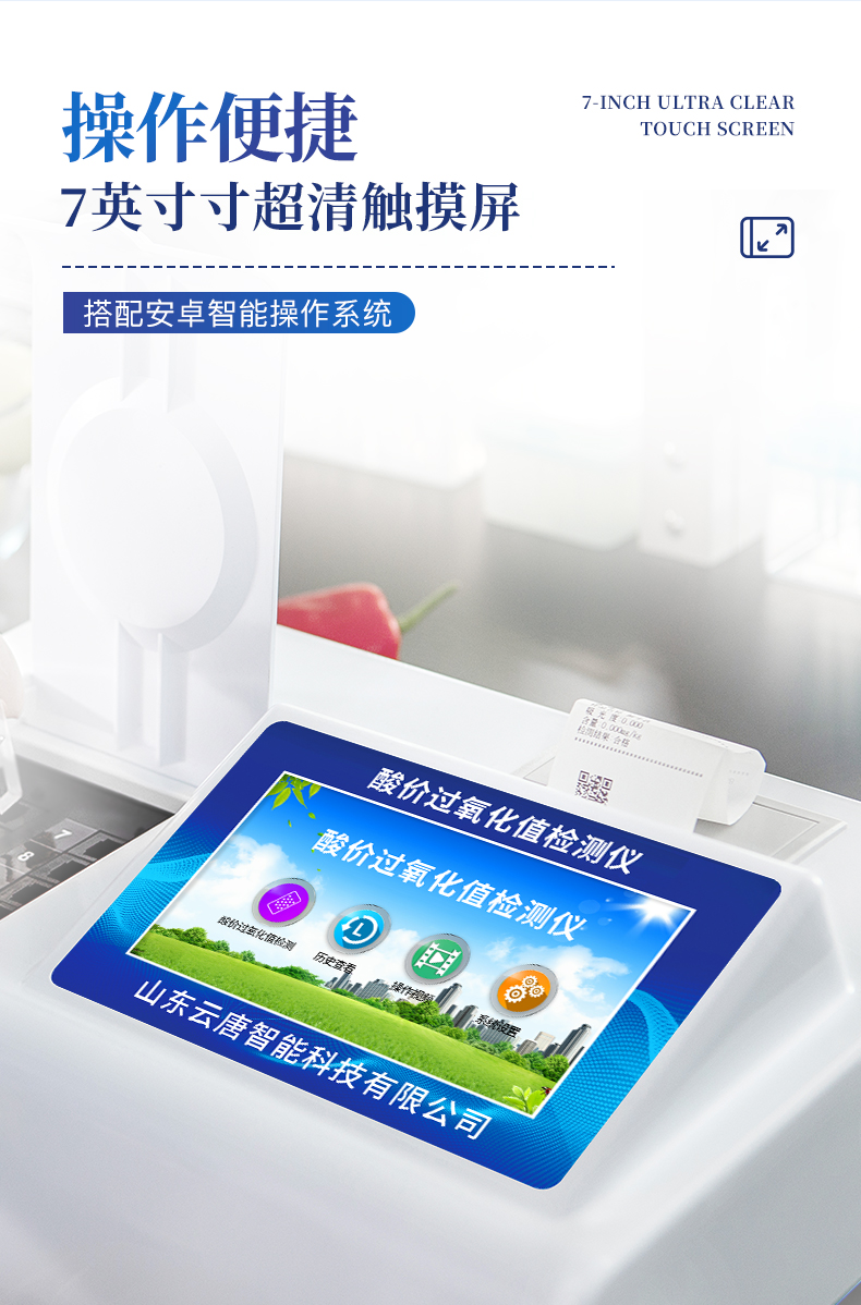 | 安卓智能操作系统,采用更加**和人性化操作,仪器具有网线连接、wifi联网上传、GPRS无线远传功能,快速上传数据。 | 一体化便携式快检设备,满足现场及流动检测使用需求,能够在同一软件下实现所有检测项目的检测,并可通过同一窗口直观显示检测结果。 | 智能化程度高,仪器具有自检功能:具有开机自检和调零功能,具有自动检测重复性功能。 | 检测通道:≥12个检测通道,可以同时测试多个样品,每个样品由程序控制分别独立工作,不会互相干扰。 | 显示方式:≥8英寸液晶触摸屏显示,人性化中文操作界面,读数直观、简单。 | 配备新一代嵌入式热敏打印机,可选择手动打印或者自动打印,检测完成可自动打印检测报告和二维码。 | 光源采用进口超高亮发光二极管,高精度、稳定性强、光源可控、可以关掉不使用的光源,功耗更低。 | 采用USB2.0接口设计,方便数据的存贮和移动,并可随时与计算机直接相连,并且可用计算机控制仪器。实现数据查询、浏览、分析、统计、打印等。 | 仪器具有品类多种类样品菜单库,可灵活选择检测样品,不同的检测通道可同时检测不同的样品项目。 | 样品处理简单省力,整体操作快速、安全、便捷。 | 仪器具有自身保护功能,可设置用户名及密码,防止非工作人员操作等。 | 高灵敏度,高检测精度,高重复性精度,扫描式高精度光学传感器。 | 过氧化值检测仪器具有重新校准、锁定、恢复出厂设置功能。 | 结果判定线可修改,对照值标定值可保存,断电不丢失数据。 |