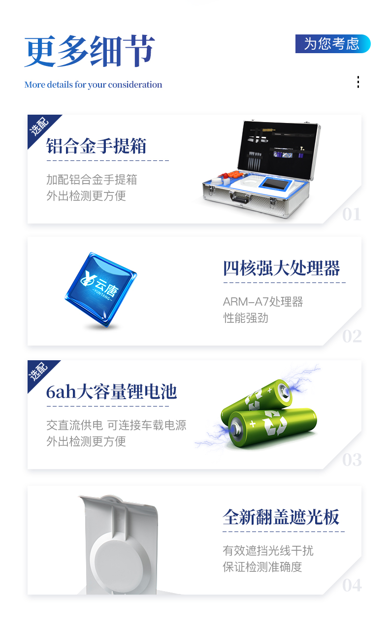 | 主控芯片采用ARM Cortex-A7,RK3288/4核处理器,主频1.88Ghz,运转速度更快速,稳定性更强。 | 显示方式:7英寸液晶触摸屏显示,人性化中文操作界面,读数直观、简单。 | 直流12V供电,可连接车载电源,可配6ah大容量充电锂电池,方便户外流动测试。 | 双波长冷光源,每个通道均配置405、528nm波长光源,标配**的光路切换装置,专利光路切换功能可实现*多64波长,并且所有检测项目可实现所有通道同时检测。 | 光源亮度自动调节与校准 | 智能恒流稳压,光强自动校准,长时间连续工作光源无温漂现象。 | 内置新国家限量标准,与所测结果进行现场比对,并持续更新标准。 | 不间断进样,连续检测 | 样本编号自动累加 | 检测项目可扩充。 | 检测结果可批量打印,批量上传。 | 检测结果为Excel表格,连接电脑即可拷贝。 | 支持U盘存储,标准USB接口,免驱动安装。 | 可配置大容量锂电池,固件可升级 |