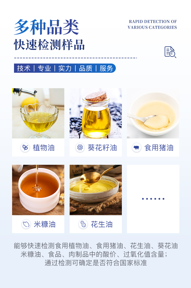 产品用途: 食用油过氧化值检测仪为集成化油品快速检测分析设备,能够快速检测食用植物油、食用猪油、花生油、葵花油、米糠油、食品、肉制品中的过氧化值含量;通过检测可确定植物油是否符合国家···