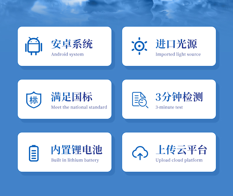 | PH、溶解氧、氨氮、亚硝酸盐、硫化氢、总碱度、检测指标等 | 安卓智能系统操作更佳简便快捷 | 内置操作流程、操作简单、无需培训、直接上手 | 检测速度快,现场读取数据; | 便携式体积小,重量轻,方便户外检测 | 外形小巧美观,工作稳定免维护,具有较好的性价比 | 采用进口冷光源,光学性能稳定,寿命长达10万小时 |