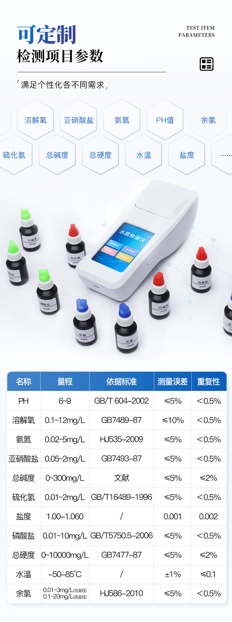 | 参数名称 | pH | 溶解氧 | 氨氮 | 亚硝酸盐 | 硫化氢 | 总碱度 |