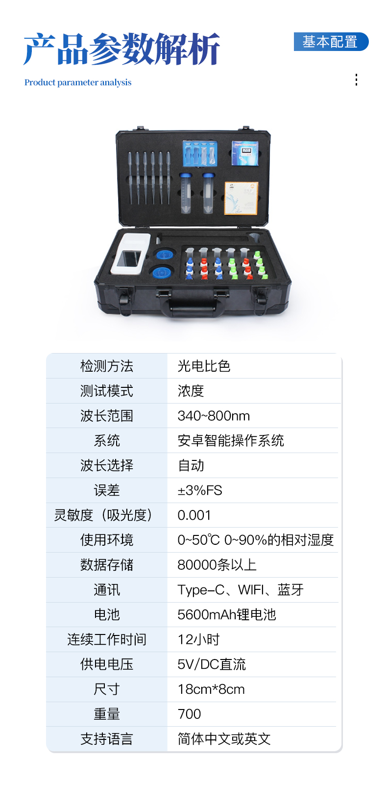 检测方法:光电比色测试模式:浓度波长范围:340~800nm系统:安卓智能操作系统波长选择:自动显示屏幕:3.5寸彩色液晶屏稳定性:<0.5%灵 敏 度(吸光度):0.001使用环境:0~50℃ 0~90%的相对湿度数据存储:80000条以上通讯:Type-C、WIFI、蓝牙电池:5600mAh锂电池连续工作时间:12小时供电电压:5V/DC直流尺寸:18cm*8cm重量:700g支持语言:简体中文或英文