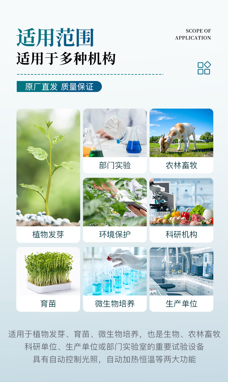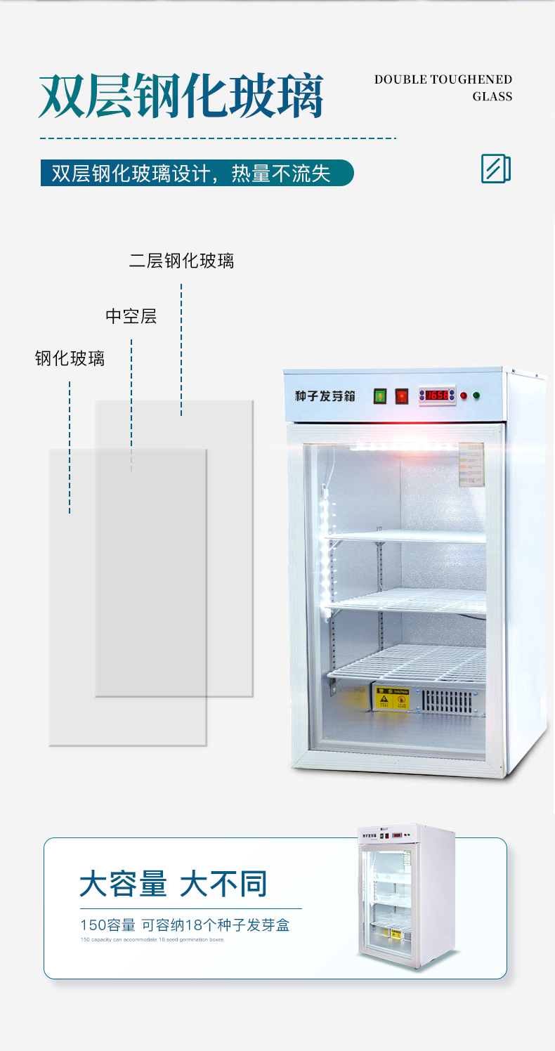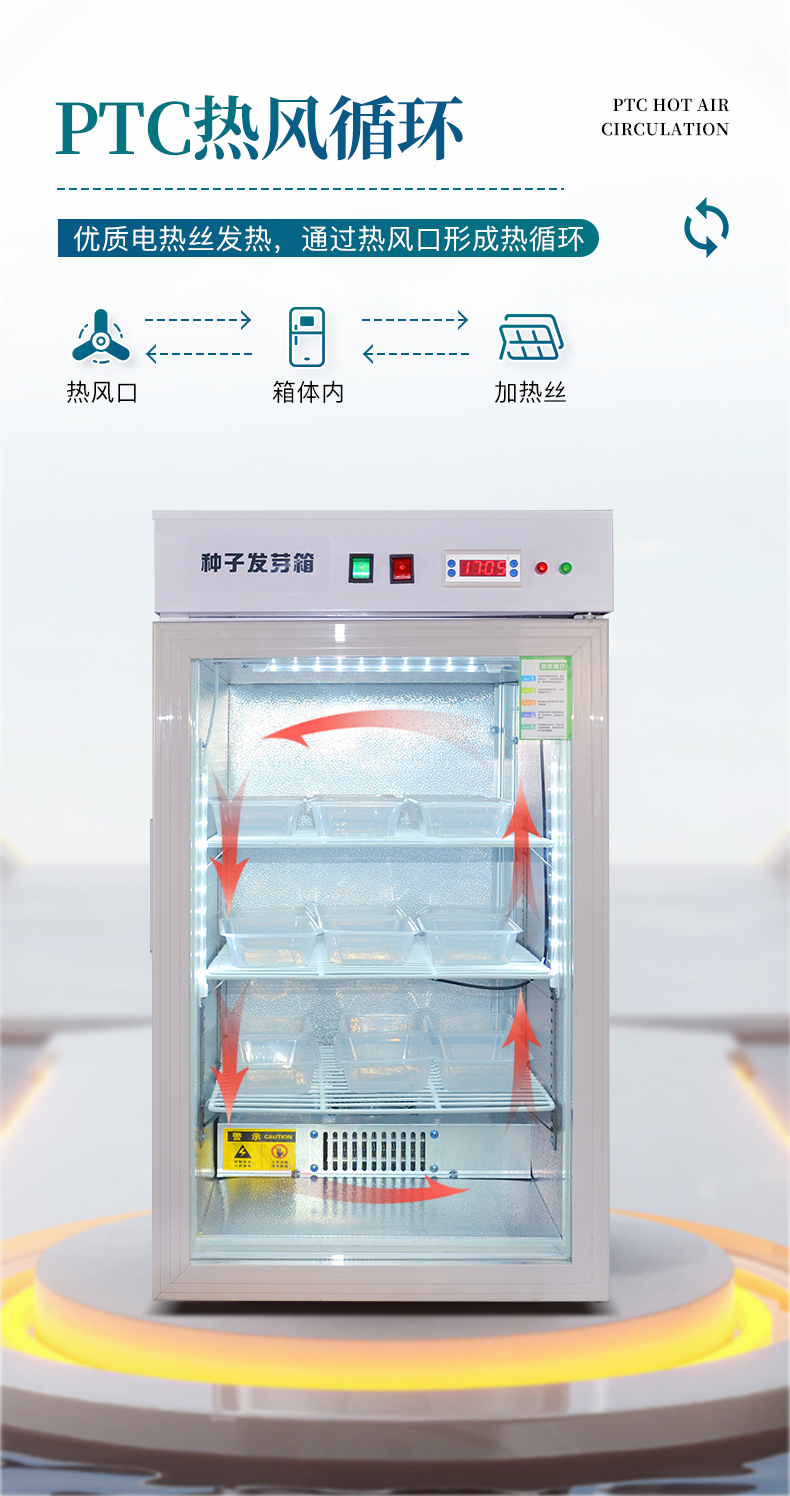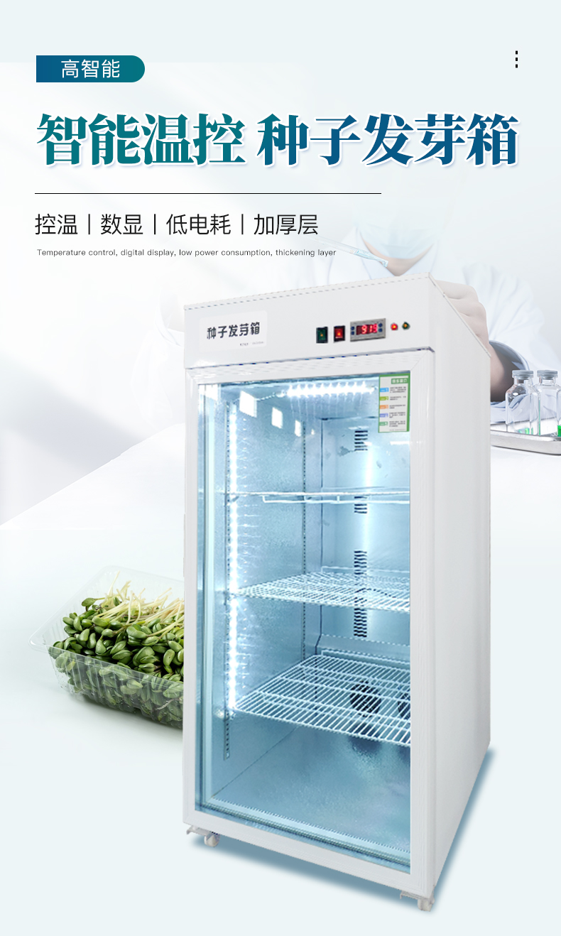 此箱可在不同地区不同季节使用不同的种子恒温快速发芽,由于恒温的作用,使种子的蛋白酶等化学物质迅速分解反应,避免了温差出芽造成的能量丢失,使种子出芽后抗病力强,提高幼苗免疫能力,缩短了种子的出芽的时间。经该器械出的幼芽,芽苗质量好,成活率高。