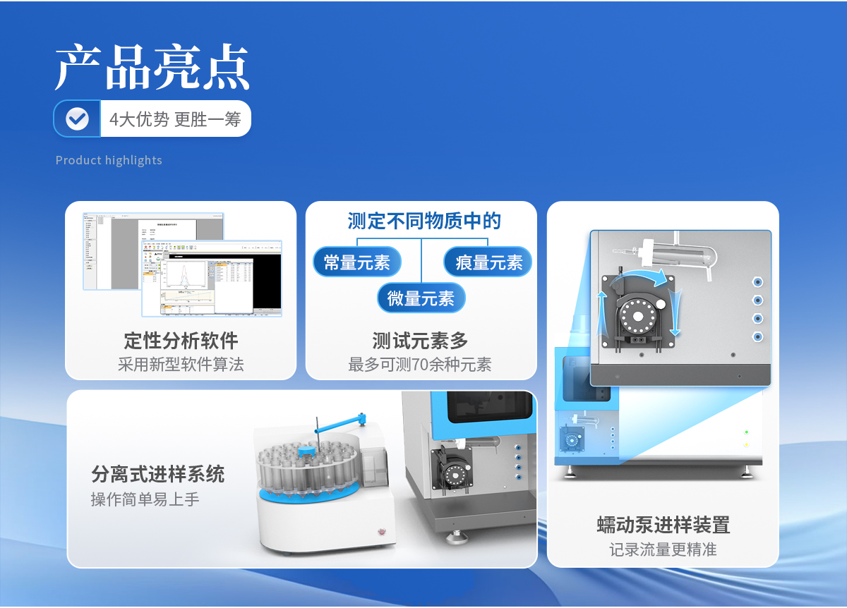 | 1、进样系统 | 1.1 加长型雾室,保证高灵敏度的情况下有效降低背景噪声,低记忆效应。 | 1.2 **同心圆雾化器,雾化效率高、重复性好,记忆效应弱,可直接自吸进样。 | 1.3 快速拆卸式炬管,搭配自主研发的炬管工装,可一秒实现炬管的准确定位,减少因更换 炬管带来的位置误差影响测试性能。 | 1.4 蠕动泵为 5 通道 16 滚轴全自动设计,蠕动泵转速连续可调。确保稳定进样的同时,可 支持进样、排废、在线内标和其他试剂进样管(氢化物发生器)同时运行。 | 1.5 分腔体式进样系统,炬管和雾室在不同的空间内,减少炬管高温对雾化的影响,也可以 直接观察样品的进行,便于实时排除异常情况。 | 1.6 多种类型的雾化器、雾室及炬管可选,可实现有机、高盐、高灵敏、耐 HF 酸等不同进 样需求,方便更换与维护。 | 1.7 集成气路全自动控制,采用精密质量流量控制器控制多路气体流量,精度 0.01L/min。 | 1.8 缺气气?;すδ?,仪器在气源耗尽的情况下自动熄火,并通过嗡鸣器实时发出报警声音。 | 1.9 火焰视频监测,仪器配置了灵敏度高的火焰传感系统,以及可视化视频监测摄像头, 可以实时观测燃烧室火焰状态,并在熄火时自动关闭射频电源,?;ひ瞧髦匾考? | 1.10 可视化的仪器运行状态监控???,可对仪器各组成部件的运行情况进行监测,判断故 障原因,便于各部件的正常运行。 |