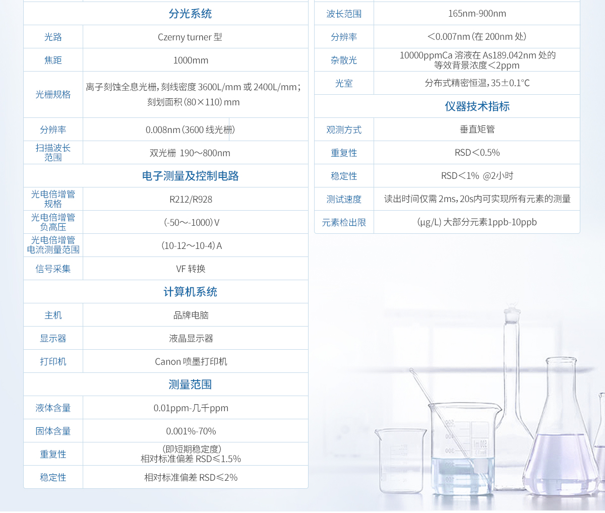| 6、性能指标 | 6.1 分析速度:≥每分钟 50 个元素或谱线,而且每条测量谱线的积分时间≥10 秒; | 6.2 样品消耗量:<2ml,测定不少于 70 个元素; | 6.3 谱线灵活性:可实现分析元素的定性、半定量和定量分析; | 6.4 线性动态范围:≥106; | 6.5 内标校正:内标校正功能,可实现内标元素和测量元素的同时曝光; | 6.6 精密度:测定 1ppm 或 10ppm 多元素混合标准溶液,重复测定十次的 RSD≤0.5%; | 6.7 稳定性:测定 1ppm 或 10ppm 多元素混合标准溶液,长时间稳定性 RSD<1.0%; | 6.8 检出限:典型元素检出限z低可达 0.1ug/L。 |