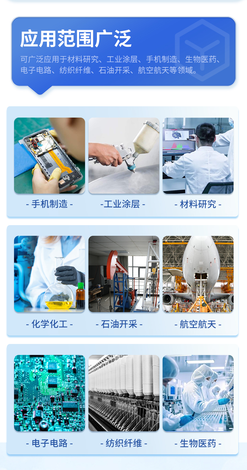 可广泛应用于材料研究、工业涂层、手机制造、生物医药、电子电路、纺织纤维、石油开采、航空航天等领域。
