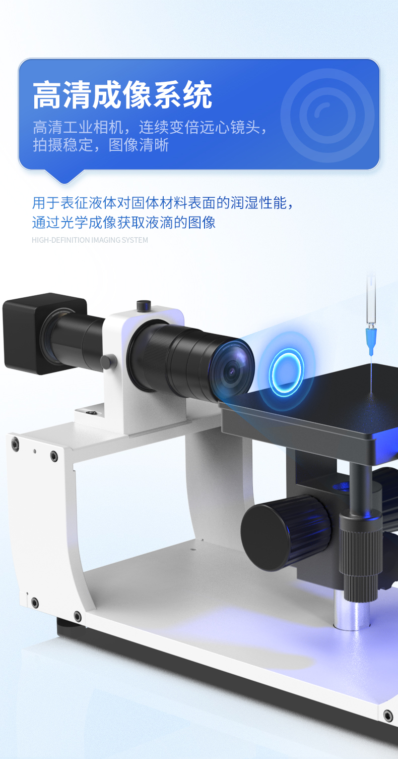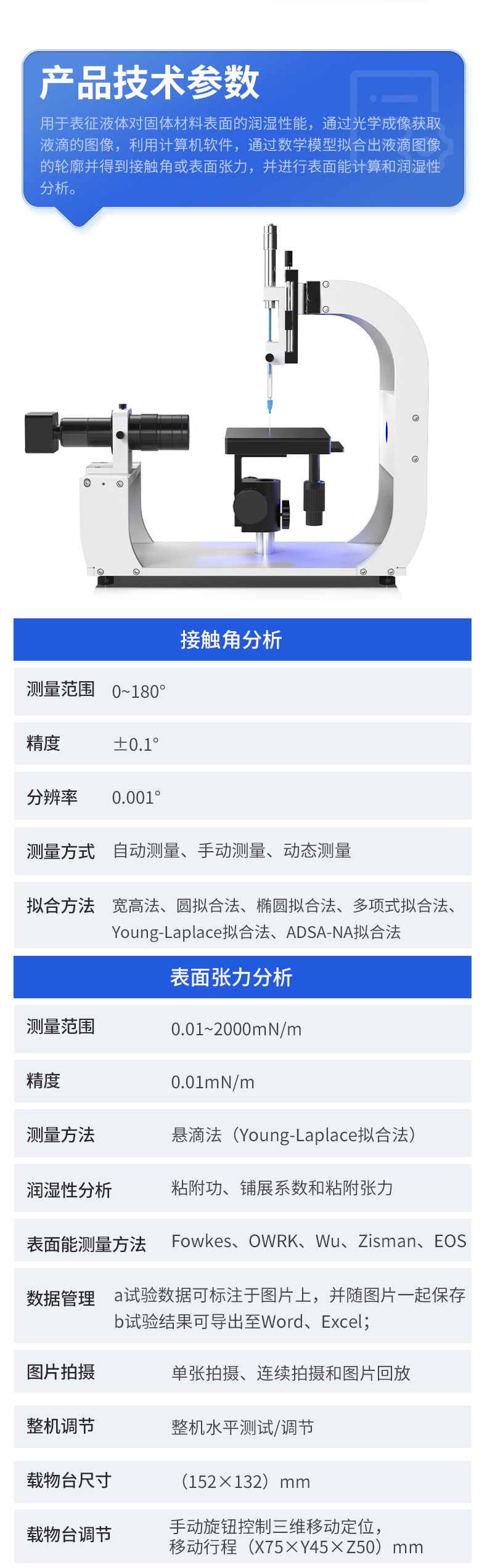 光学接触角测量仪是测量液体对固体材料接触角的仪器,主要用于表征液体对固体材料表面的润湿性能,通过光学成像获取液滴的图像,利用计算机软件,通过数学模型拟合出液滴图像的轮廓并得到接触角或表面张力,并进行表面能计算和润湿性分析。