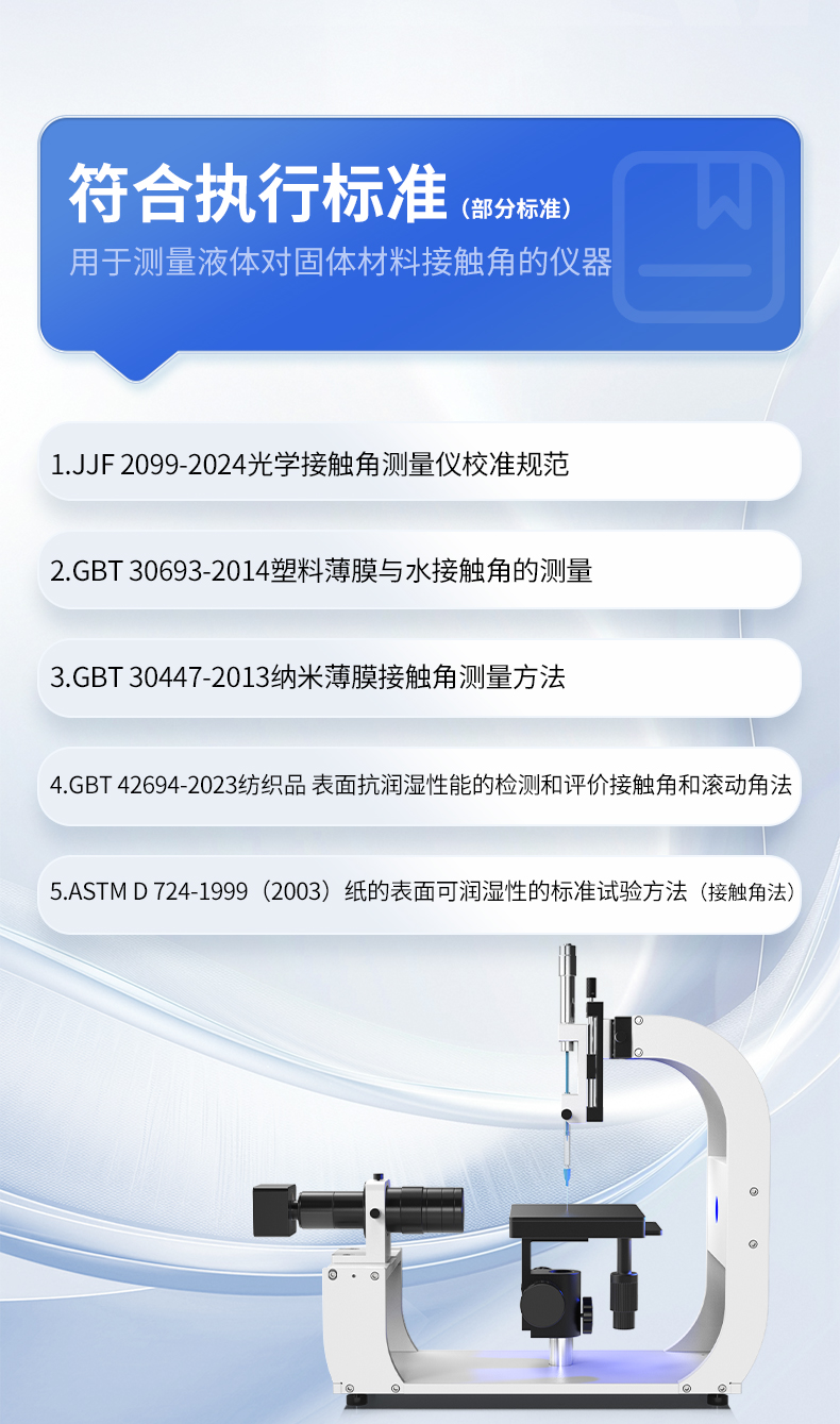 | 1.JJF 2099-2024光学接触角测量仪校准规范; | 2.GBT 30693-2014塑料薄膜与水接触角的测量; | 3.GBT 30447-2013纳米薄膜接触角测量方法; | 4.GBT 42694-2023纺织品 表面抗润湿性能的检测和评价 接触角和滚动角法; | 5.ASTM D 724-1999(2003)纸的表面可润湿性的标准试验方法(接触角法); |