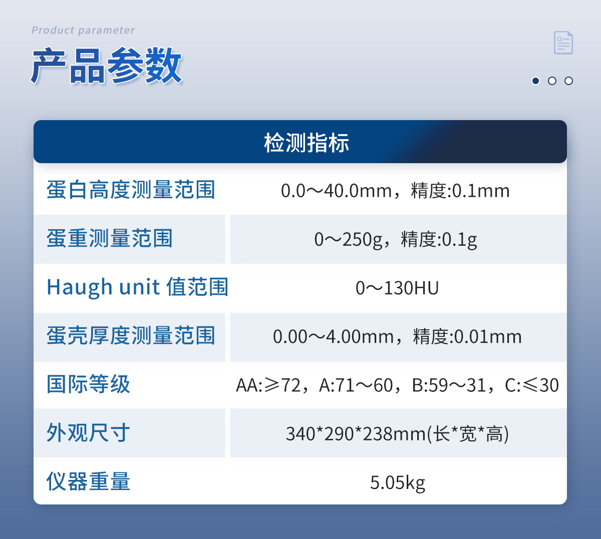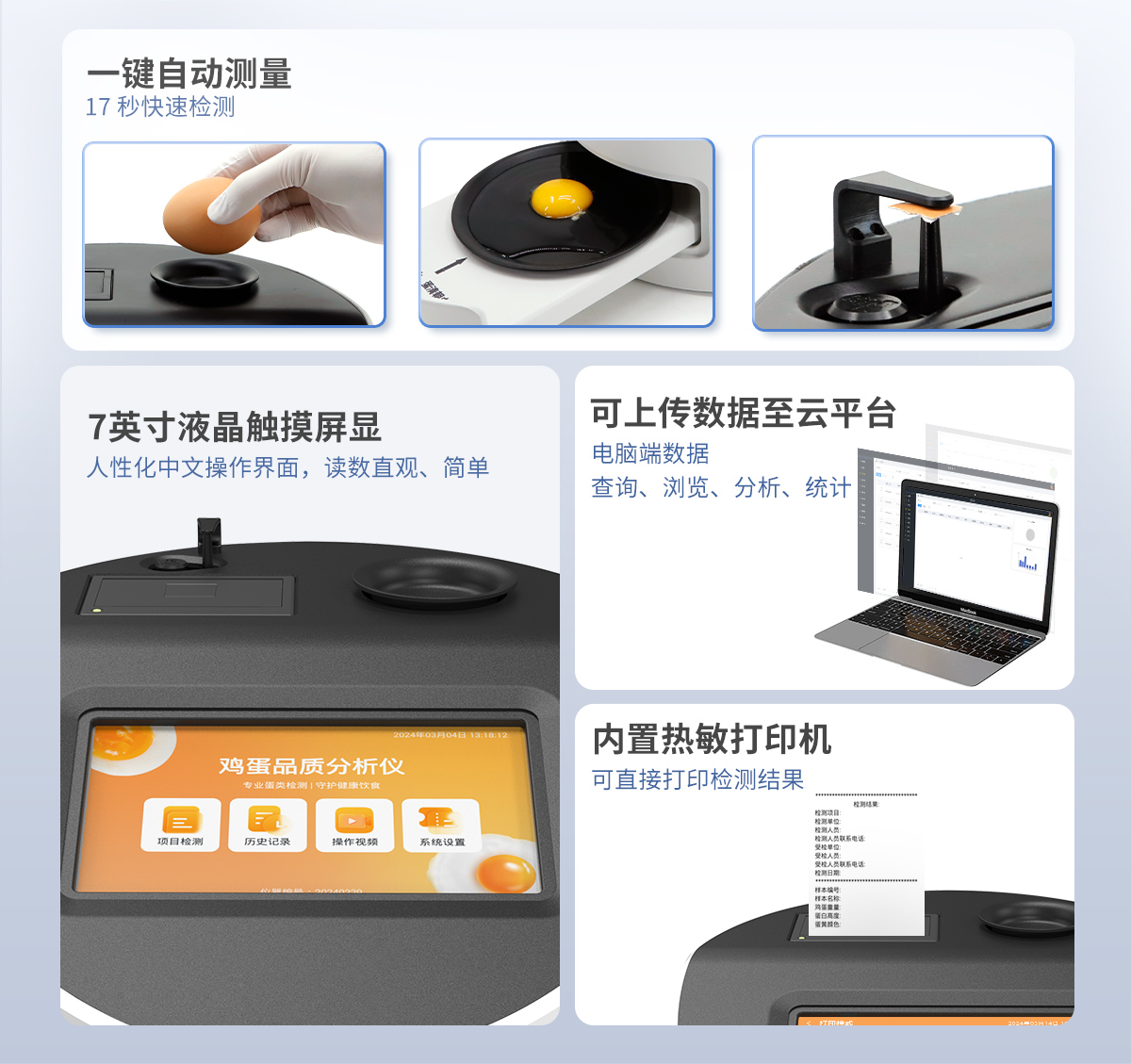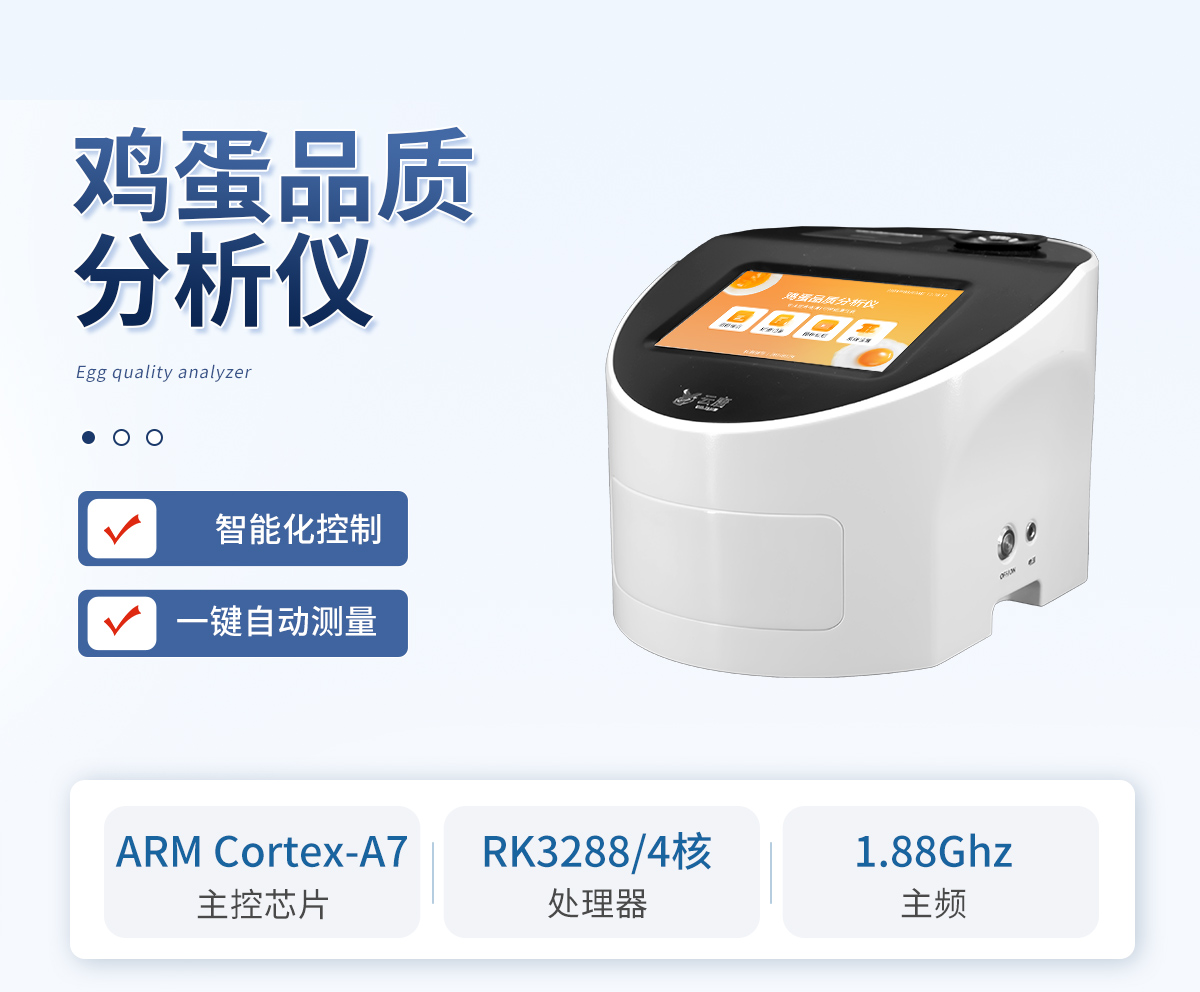 | 1.仪器采用7英寸液晶触摸屏,搭配运行安卓智能操作系统,主控芯片采用ARM Cortex-A7,RK3288/4核处理器,主频1.88Ghz,操作方便,性能更强。 | 2.仪器采用智能化控制,可一键自动测量蛋重、蛋白高度、新鲜度(哈夫单位)、蛋黄高度、蛋壳厚度。 | 3.高精度数字传感器,测量结果精度高,稳定性好。 | 4.创新采用高精超声波传感器测试蛋白高度,精密传感器测试蛋黄颜色,无需直接接触蛋液,减少误差存在。 | 5.仪器测试性能稳定,不受操作人员的能力影响,方便简单。 | 6.可一键自动测量哈夫单位、蛋重、蛋白高度、蛋黄高度和蛋壳厚度,把测试时间缩短到 17 秒。 | 7.仪器可本机存储数据,可连接USB端口将数据导出存储。另外,仪器自带数据上传???,具有WIFI联网上传、RJ45网线连接功能,数据可实现局域网和互联网数据上传,检测结果可选择直接传至数据平台,进行大数据分析处理与数据统计,达到长期分析监测的目的。 | 8.打印系统:内置全新打印机,可以打印项目名称、二维码、抽样信息、检测信息、受检信息、复核信息、抽样日期、检测日期等信息。 | 9.供电模式:仪器交直流两用,直流12V供电(标配),可连接车载电源,亦可选配6ah大容量充电锂电池,方便户外流动测试。 | 10.仪器具有重新校准、锁定功能。 | 11.检测指标: | (1)蛋白高度测量范围:0.0~40.0mm,精度:0.1mm ; | (2)蛋重测量范围:0~250g,精度:0.1g ; | (3) Haugh unit 值范围:0~130HU; | (4)国际等级:AA:≥72,A:71~60,B:59~31,C:≤30; | 12.外观尺寸:340*290*238mm(长*宽*高),仪器重量:5.05kg。 |