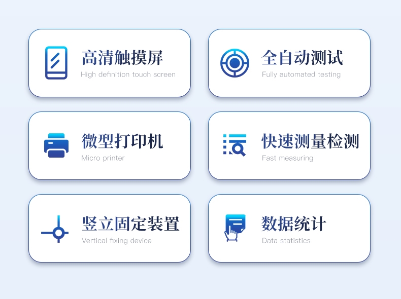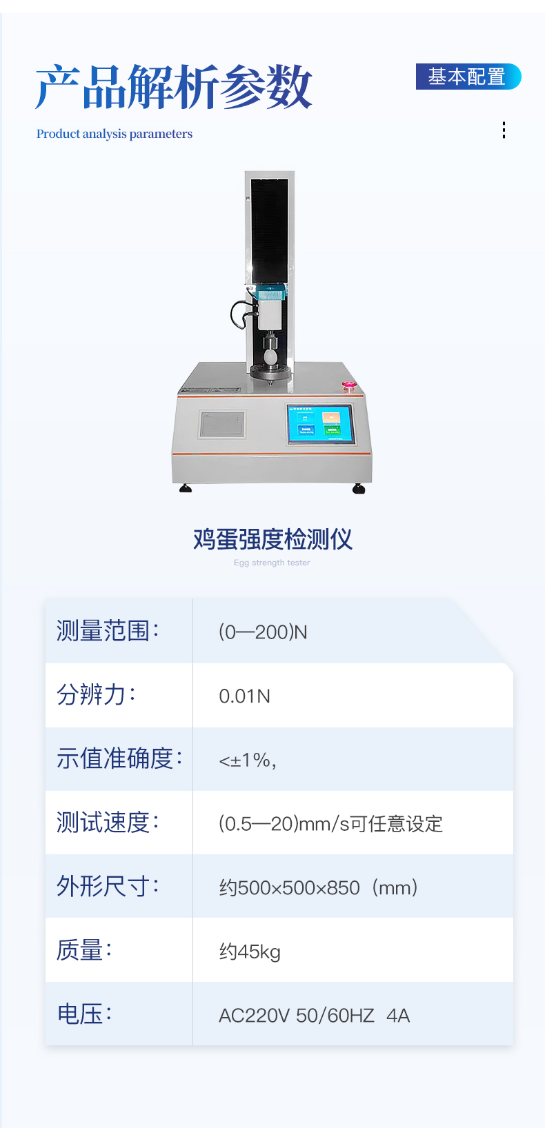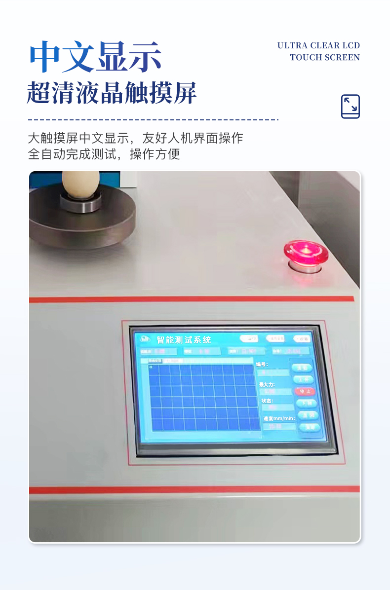 | 1、采用芯片控制,高精度测力传感器,精度高。 | 2、采用高性能步进电机,精密滚珠丝杆传动,保证该仪器传动精准。 | 3、大触摸屏中文显示,友好人机界面操作。全自动完成测试。操作方便,具有测试数据统计处理功能,微型打印机输出。 | 4、随机配备蛋壳竖立固定装置,方便快速测量。 |