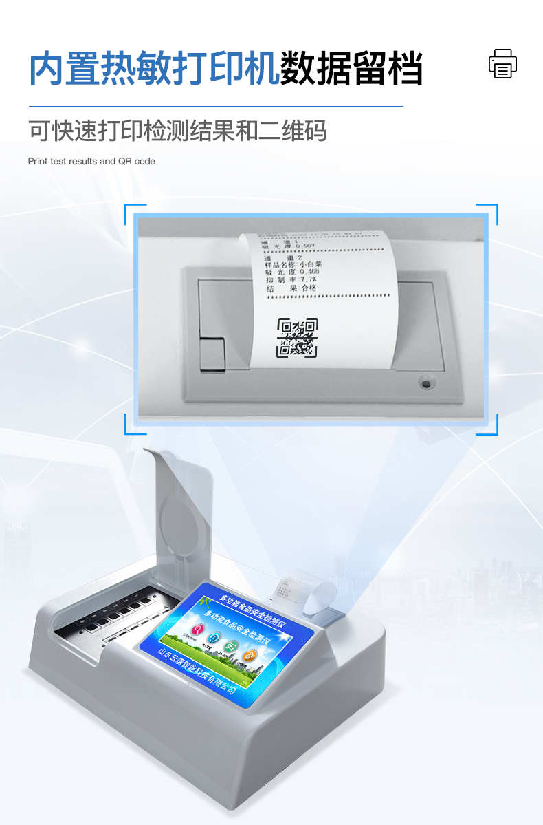 | 安卓智能操作系统,采用更加**和人性化操作,仪器具有网线连接、wifi联网上传、GPRS无线远传功能,快速上传数据。 | 智能化程度高,仪器具有自检功能:具有开机自检和调零功能,具有自动检测重复性功能。 | 检测通道:≥12个检测通道,可以同时测试多个样品,每个样品由程序控制分别独立工作,不会互相干扰。 | 配备新一代嵌入式热敏打印机,检测完成可自动打印检测报告和二维码。 | 采用标准USB2.0接口设计,支持U盘存储,免驱动插拔,方便数据灵活存贮和移动。 | 仪器带有监管平台。检测结果可直接无线上传。实现数据查询、浏览、分析、统计、打印等,并可进行数据曲线图和饼状图分析处理,检测食品甲醛等长短期动态,达到问题预估、预警。 | 仪器具有品类多种类样品菜单库,可灵活选择检测样品,不同的检测通道可同时检测不同的样品项目。 | 样品处理简单省力,整体操作快速、安全、便捷。 | 仪器具有自身保护功能,可设置用户名及密码,防止非工作人员操作等。 | 仪器具有重新校准、锁定、恢复出厂设置功能。 |