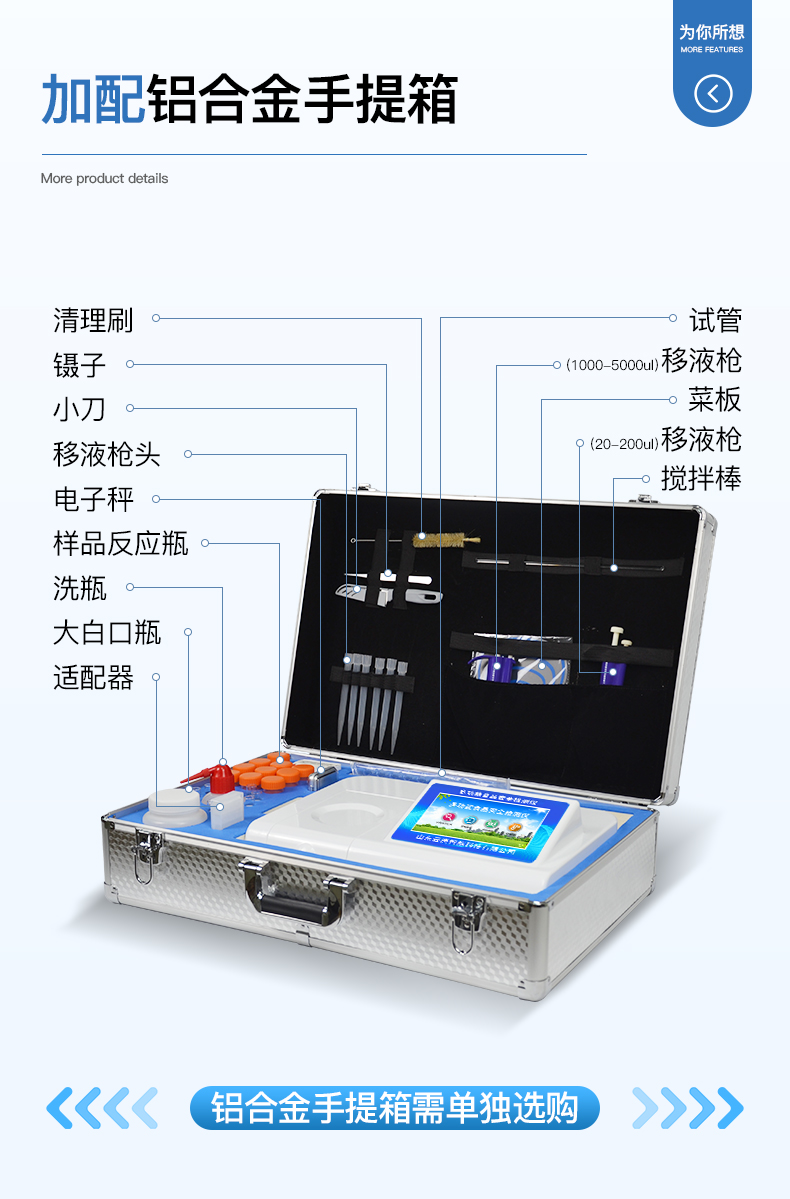 | 主控芯片采用ARM Cortex-A7,RK3288/4核处理器,主频1.88Ghz,运转速度更快速,稳定性更强。 | 显示方式:7英寸液晶触摸屏显示,人性化中文操作界面,读数直观、简单。 | 直流12V供电,可连接车载电源,可配6ah大容量充电锂电池,方便户外流动测试。 | 智能恒流稳压,光强自动校准,长时间连续工作光源无温漂现象。 | 不间断进样,连续检测 | 样本编号自动累加。 | 检测项目可扩充。 | 检测结果可批量打印,批量上传 | 可配置大容量锂电池,固件可升级 |