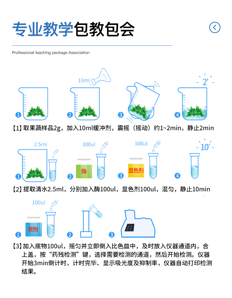 | 仪器构成:由主机、样品前处理器具和试剂盒等构成,适于现场及实验室使用 | 光路系统:采用进口超高亮发光二极管,光源和检测器采用全固态结构,准确度和精密度高、稳定性强、光源可控;采用光源自动开关节能设计,光源使用寿命达10万小时以上。 | 内置曲线:仪器具有内置工作曲线,无需配制标准溶液,只需要用配套试剂进行零点校正后,即可实现样品的快速定量测定。 | 测量方式:样品显色和测量为为标准1cm比色皿,无需转移,提高检测精密度。 | 耗材配件:提供完备的专用前处理设备和耗材,一站式服务。 | 专用试剂盒:配备专用的预制试剂,缩短试剂配制时间,操作简单,使用方便。 |