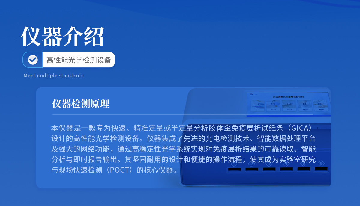 仪器简介: 本仪器是一款专为快速、精准定量或半定量分析胶体金免疫层析试纸条(GICA)设计的高性能光学检测设备。仪器集成了**的光电检测技术、智能数据处理平台、高通量设计及强大的网络功能···