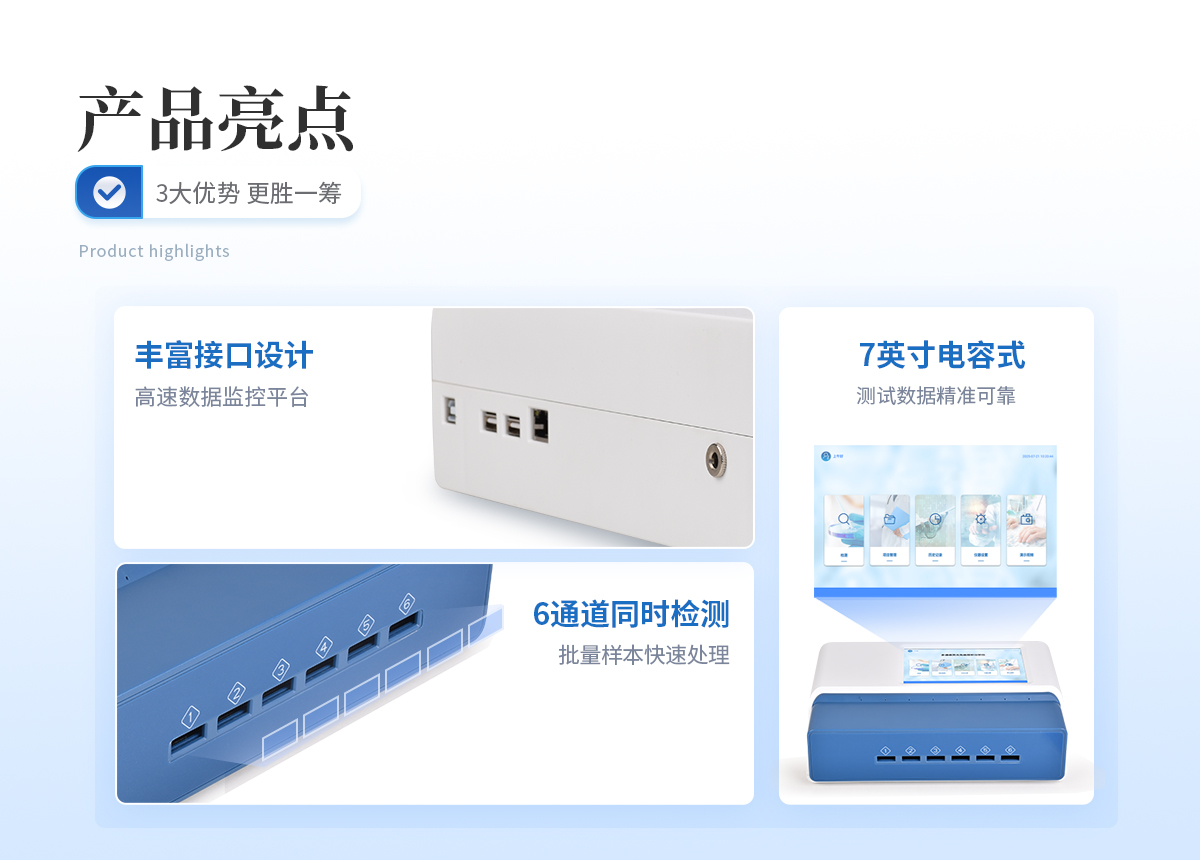 | 1、 Android触控系统结合大尺寸高清屏幕,界面友好,操作简单流畅,无需外接设备; | 2、 6通道可以同时检测不同项目,显著提升检测效率,满足批量样本快速处理需求; | 3、 二维码扫描录入样本信息,避免人工错误 | 4、 8G超大容量内存,支持按日期灵活查询、预览、删除结果,并生成多样化专业报告。 | 5、 内置热敏打印机,检测完成即可现场打印标准报告,提升工作效率。 | 6、 关键部件实时自诊断功能,保障仪器长期稳定运行。 | 7、 高速有线/无线网络及蓝牙,构建完善的数据监控平台,实现数据实时上传、远程查询、统计分析和监管协同。 | 8、 丰富的接口设计,轻松连接电脑、U盘、网络及上位机系统,支持U盘导出。 | 9、 孵育??槲囟ㄊ灾教醴从μ峁?*温度环境。 | 10、 流线型结构,紧凑轻便,兼顾实验室耐用性与检测需求。 | 11、 插卡判断:检测卡未插入检测通道不能内置质控功能,可设备送检、设备自检、试剂卡自检测方式:孵育检测、即时检测(对检测数据复检核实) | 12、 检测曲线:可以对试剂卡的检测核验,防止误判 | 13、 检测结果:报告出检测项目、被测物质的浓度、检测单位、被检查单位、检验员、检测时间、检测限等信息可在触摸屏上显示,可通过仪器内置打印机输出 | 14、 项目管理:支持检测项目拓展功能 | 15、 界面设置:可修改标题和页尾信息,灵活展示仪器信息 |
