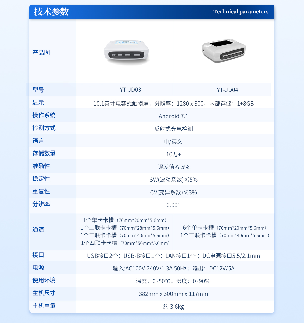 | 1、 7英寸电容式触摸屏,分辨率:1920:x:1200,内部存储:1+8GB | 2、 操作系统:Android:7.1 | 3、 检测方式:反射式光电适配卡壳:70mm*20mm | 4、 语言:中/英文: | 5、 存储数量:10万+ | 6、 准确性:误差值≤:5% | 7、 稳定性:SW(波动系数)≤5% | 8、 重复性:CV(变异系数)≤3% | 9、 分辨率:0.001 | 10、检测通道:6通道检测时间:<5秒(单卡及多联卡);可对样本进行胶体金定性> | 11、数据传输:WiFi、蓝牙、USB、射频读卡、外置扫码模块(选配) | 12、数据处理:可通过通讯端口进行数据汇总、上传监管平台等 | 13、检测通道孵育检测一体,温度范围::室温:+5℃:~:60℃ | 14、打印机:热敏打印机(热敏打印纸:57*20mm) | 15、接口:USB接口:2个;USB-B接口:1个;LAN接口:1个:;DC电源接口:5.5/2.1mm | 16、电源:输入:AC100V-240V/1.3A 50Hz;输出:DC12V/5A | 17、使用环境:温度:0~50℃;湿度:0~90%: | 18、主机尺寸::308mm*205mm*91mm | 19、主机重量:约:2.7kg |