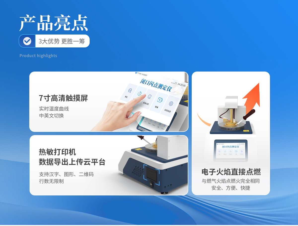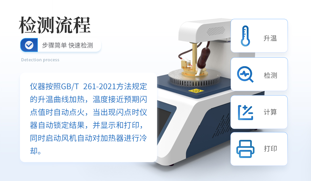 仪器按照GB/T 261-2021方法规定的升温曲线加热,温度接近预期闪点值时自动点火,当出现闪点时仪器自动锁定结果,并显示和打印,同时启动风机自动对加热器进行冷却。